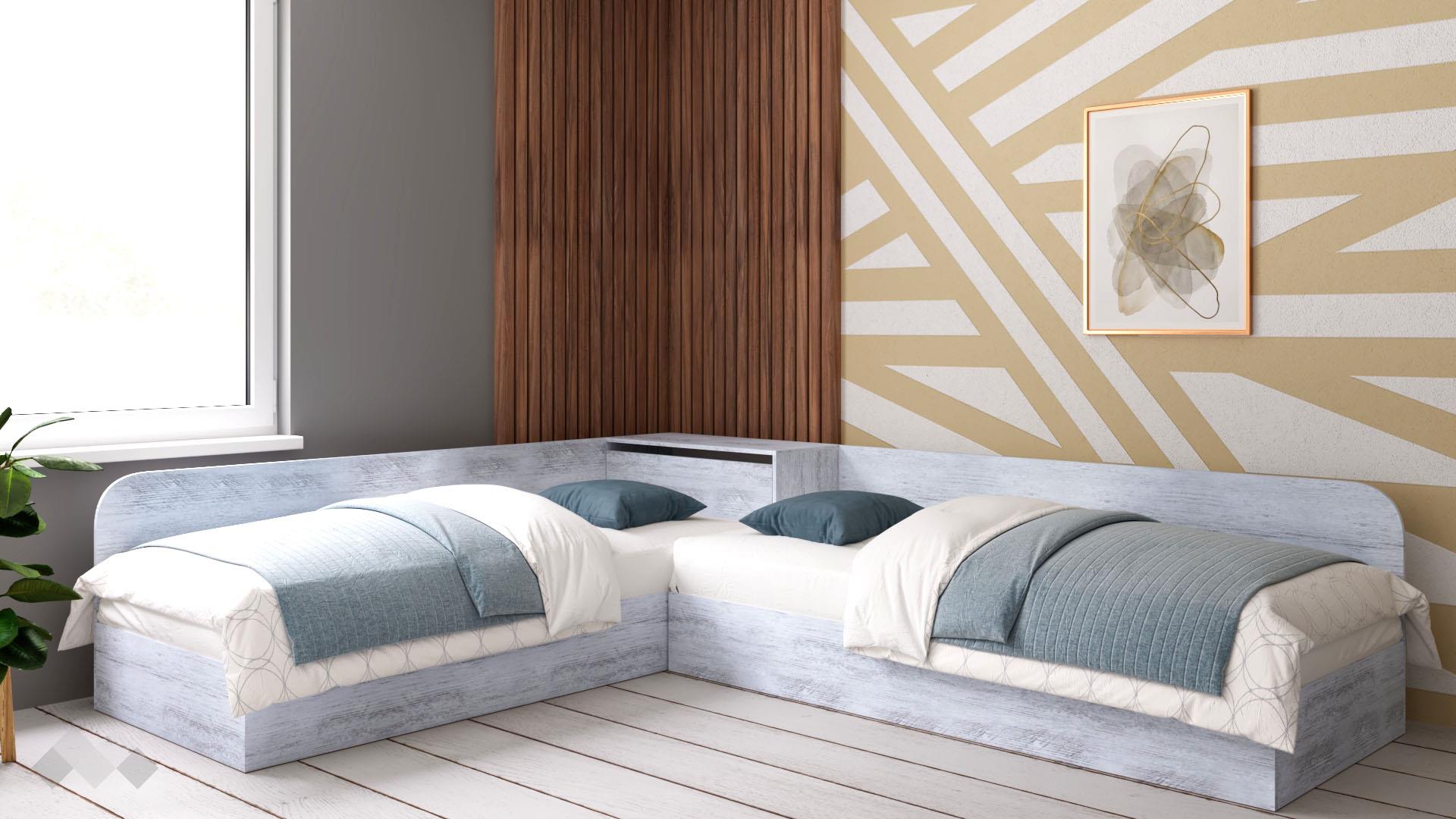 Ъгловите легла са хитър начин да използваш пространството в спалнята, в детската стая или стаята за гости. С тяхна помощ оставяш свободно място за движение в помещението и в същото време имаш лесен достъп до всяко легло. Удобно разположената между тях ракла е идеалното място, където да съхраняваш спално бельо, завивки и възглавници, така че винаги да са ти под ръка, без да се виждат.