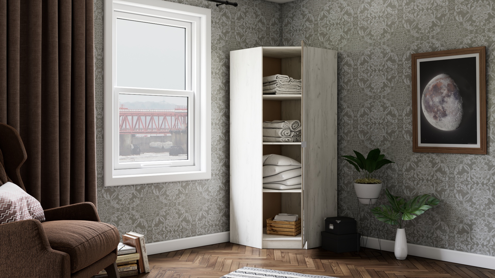 Щом отвориш гардероба, ще откриеш три удобни рафта, където можеш да организираш всички необходими дрехи, завивки, възглавници, хавлии и аксесоари. Ще ти допадне и огледалото, разположено на вратата – то е незаменим помощник при избора на тоалет. Освен това, благодарение на него стаята ще бъде по-осветена и ще изглежда визуално по-голяма.