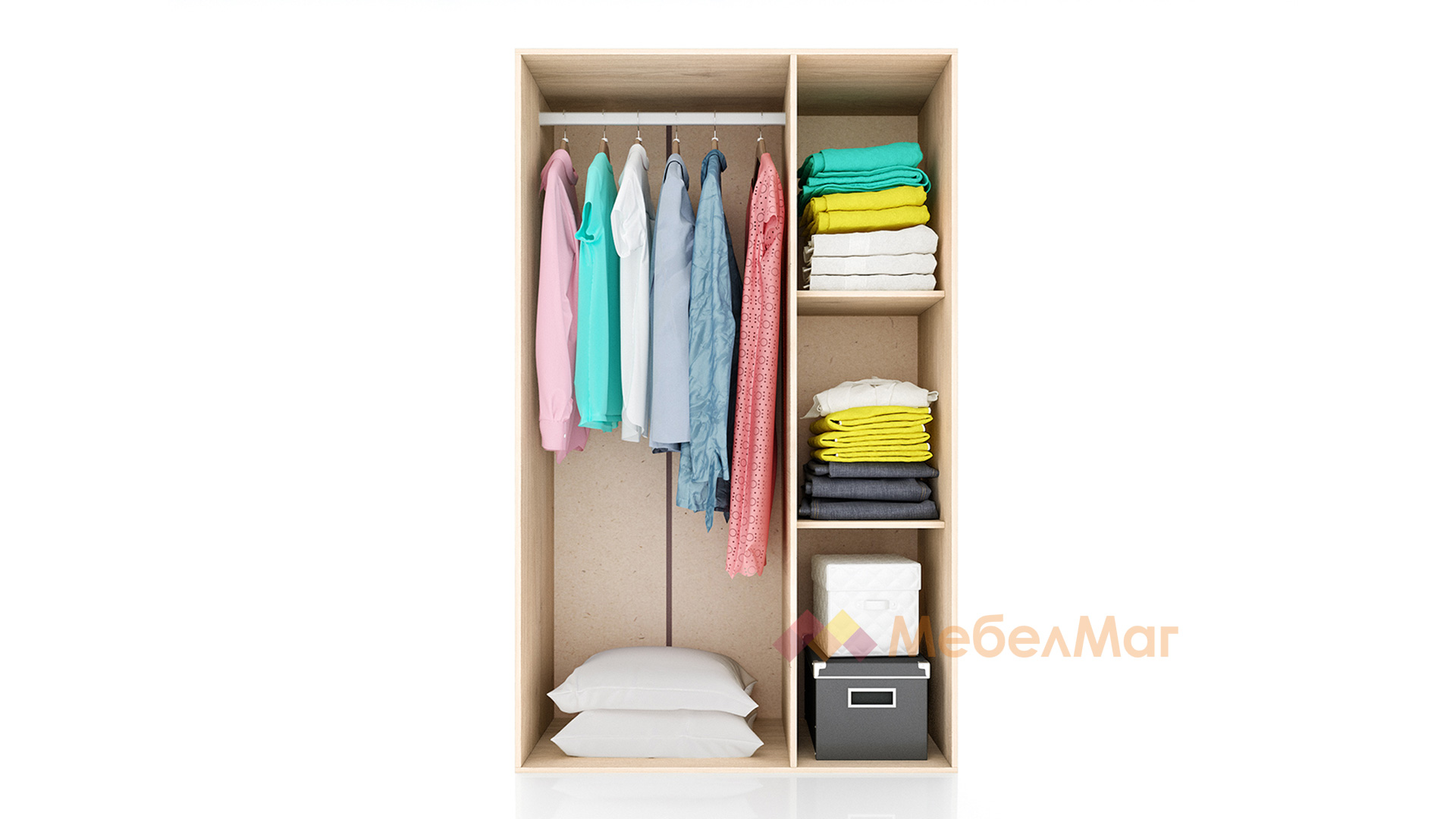 Гардеробът е трикрилен – разполага с 2 рафта и лост за закачалки.