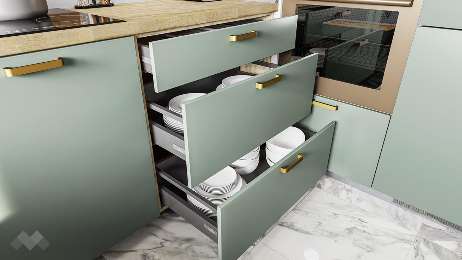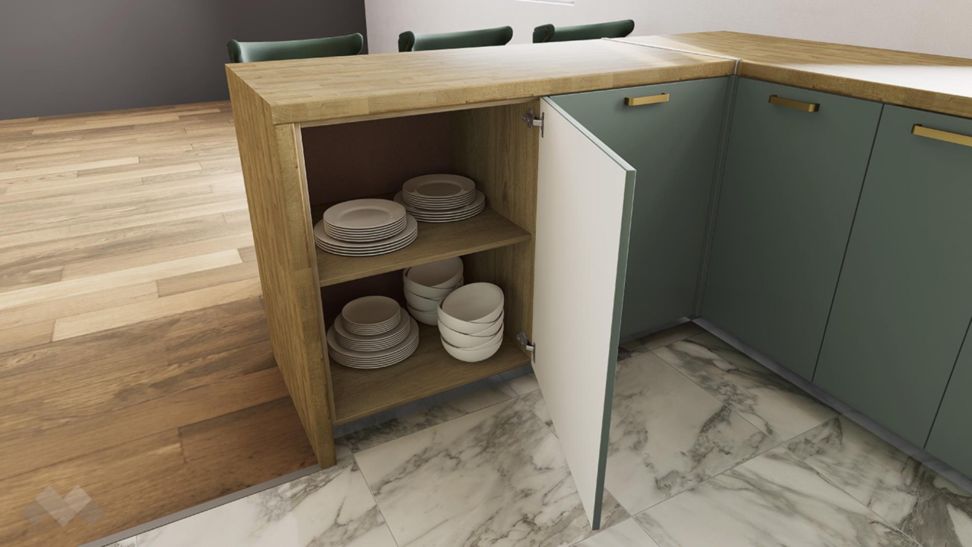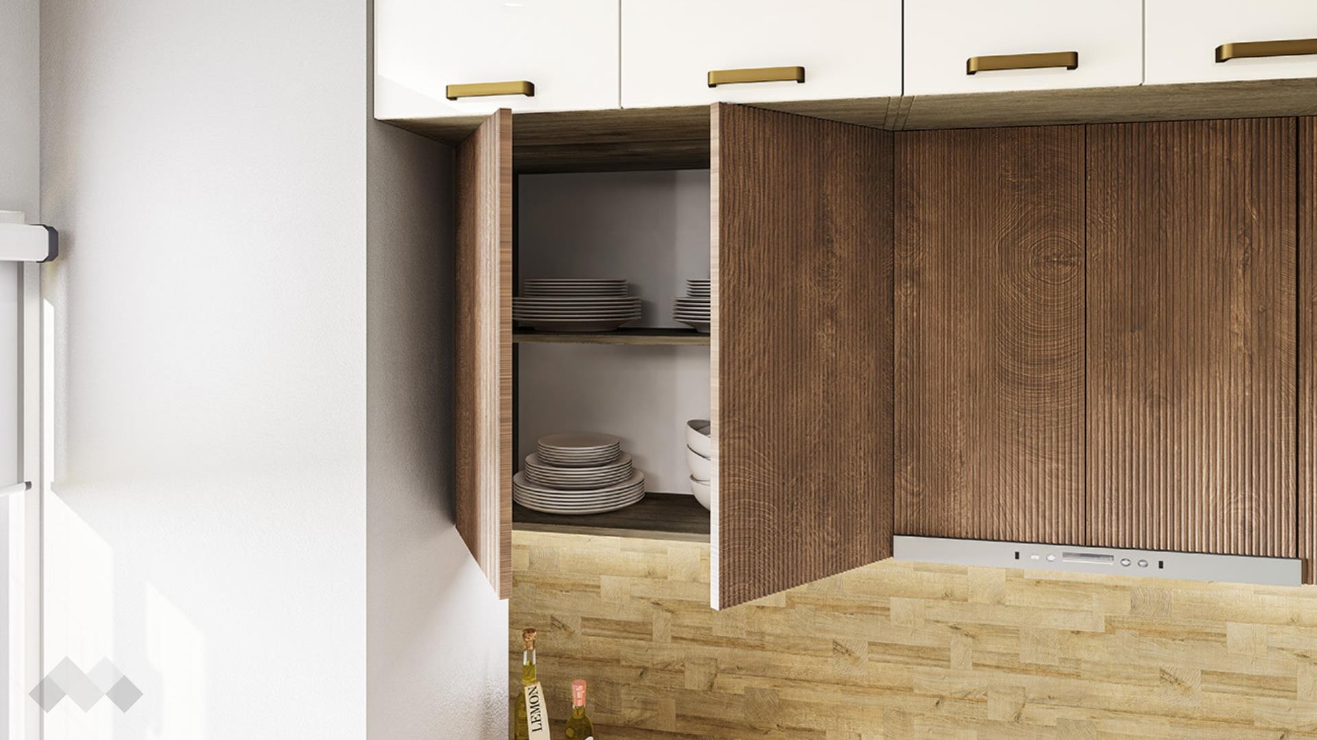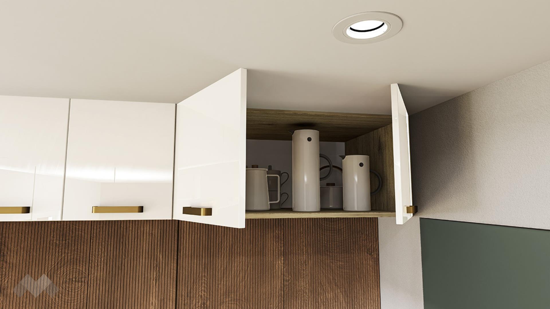 Горния ред шкафове са удобни и функционални - побират малко изполваните уреди и съдове. Основния ред горни шкафове са просторни за най-често използваните уреди и посуда. Шкаф стандартен размер за вграждане на хладилник - за да бъде всичко в синхрон. Шкаф за вграждане на фурна и микровълнова. Долния ред шкафове е функционално подбран - перфектната комбинация на рафтове и чекмеджета, за да поберат често използваните уреди, подправки и посуда. Витринния шкаф е с опушени матови стъкла 4 мм., 4 рафта и LED осветление, за да изглежда още по-елегантно. Долния ред шкафове е функционално подбран - перфектната комбинация на шкафове с рафтове и чекмеджета, за да поберат често използваните уреди, подправки и посуда, а с Г-образния остров имаш допълнително пространство за съхранение и плотове за създаване на вкусотии.