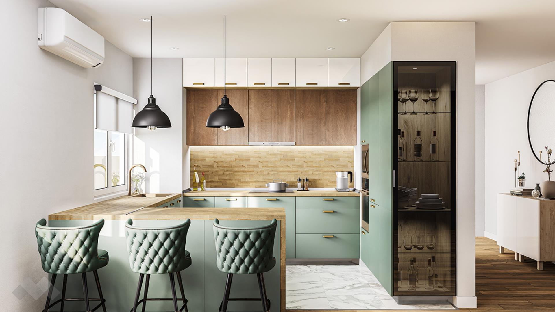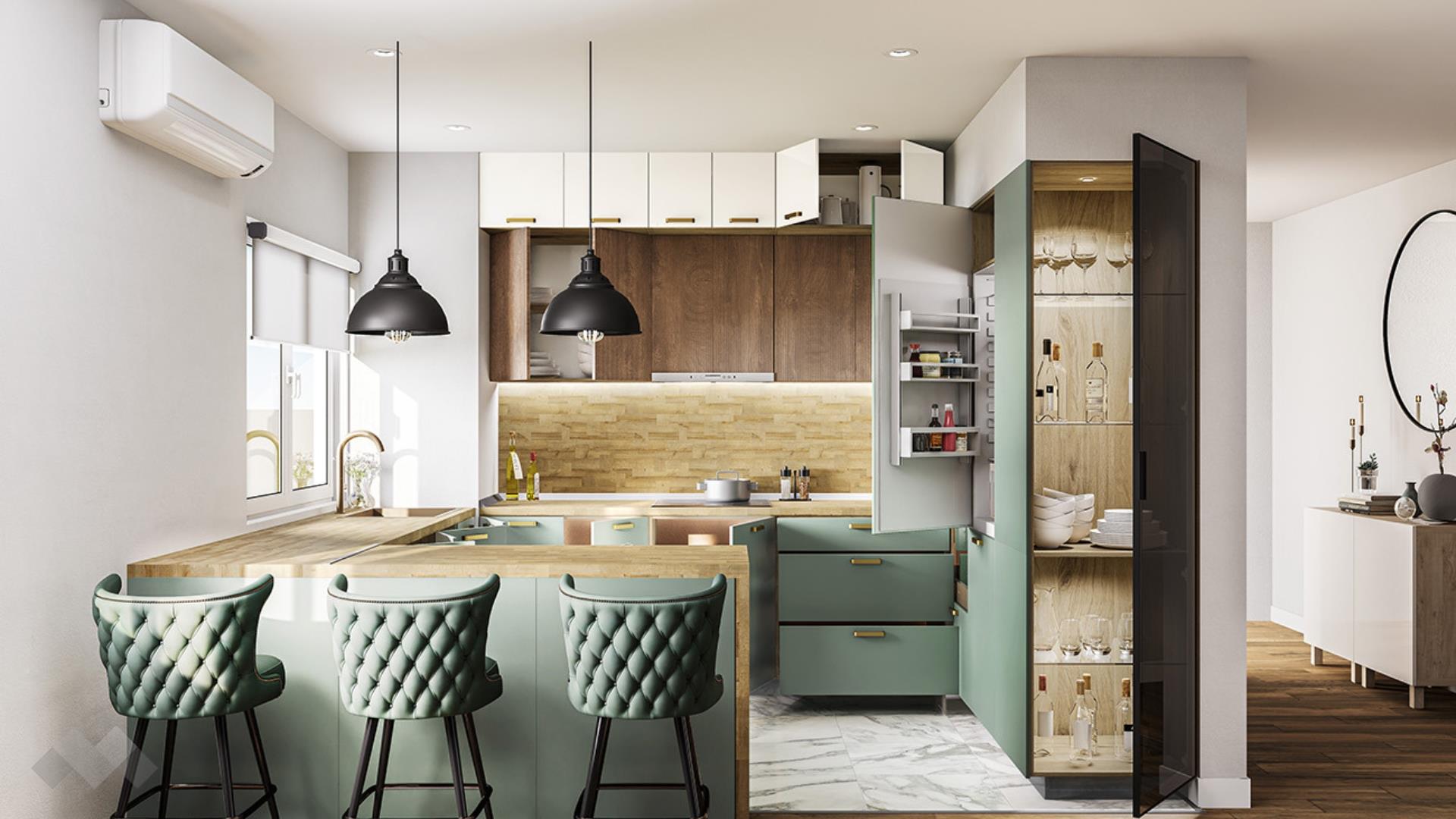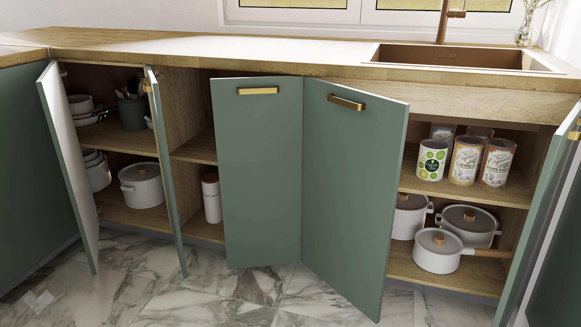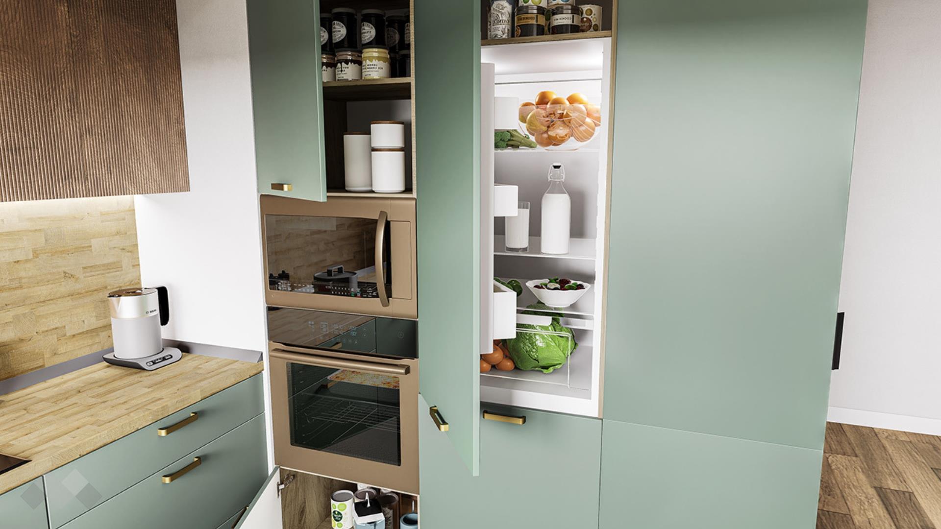 Горния ред шкафове са удобни и функционални - побират малко изполваните уреди и съдове. Основния ред горни шкафове са просторни за най-често използваните уреди и посуда. Шкаф стандартен размер за вграждане на хладилник - за да бъде всичко в синхрон. Шкаф за вграждане на фурна и микровълнова. Долния ред шкафове е функционално подбран - перфектната комбинация на рафтове и чекмеджета, за да поберат често използваните уреди, подправки и посуда. Витринния шкаф е с опушени матови стъкла 4 мм., 4 рафта и LED осветление, за да изглежда още по-елегантно. Долния ред шкафове е функционално подбран - перфектната комбинация на шкафове с рафтове и чекмеджета, за да поберат често използваните уреди, подправки и посуда, а с Г-образния остров имаш допълнително пространство за съхранение и плотове за създаване на вкусотии.