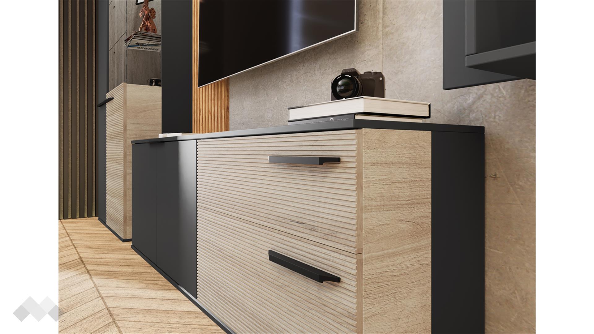 ТВ шкафът е достатъчно просторен и ти предоставя място за телевизор с размери 180/133 см. Той разполага с шкаф с вратички и две чекмеджета с пълно изтегляне и плавно затваряне. Благодарение на него, ще имаш достатъчно място за съхранение на техника, декодери и книги.