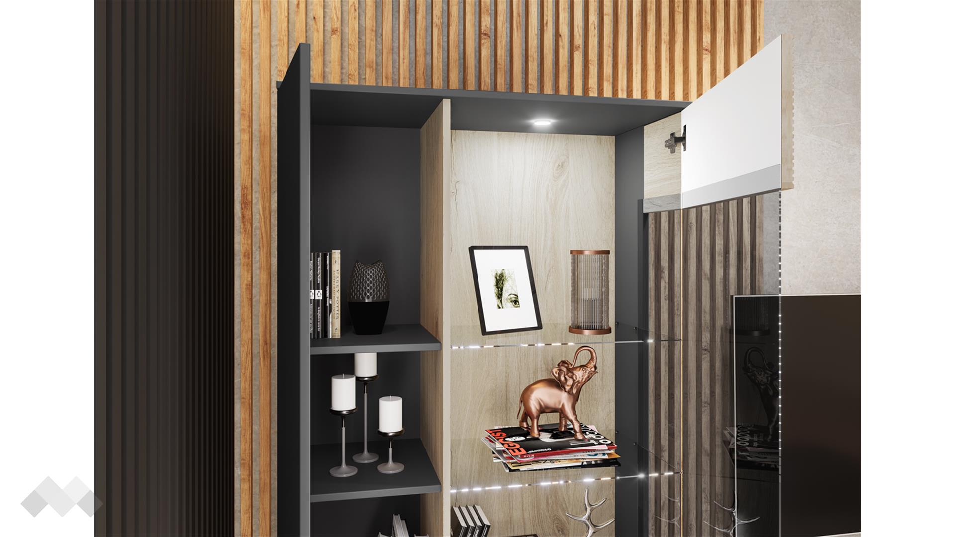 Шкафът с витрина ти предоставя възможността да избереш кое от ценните ти вещи ще блести като декорация и кое ще бъде скрито от погледа на твоите гости. В него разполагаш с цели 5 рафта, в които можеш прилежно да подредиш принадлежностите си и да организираш своя хол.
