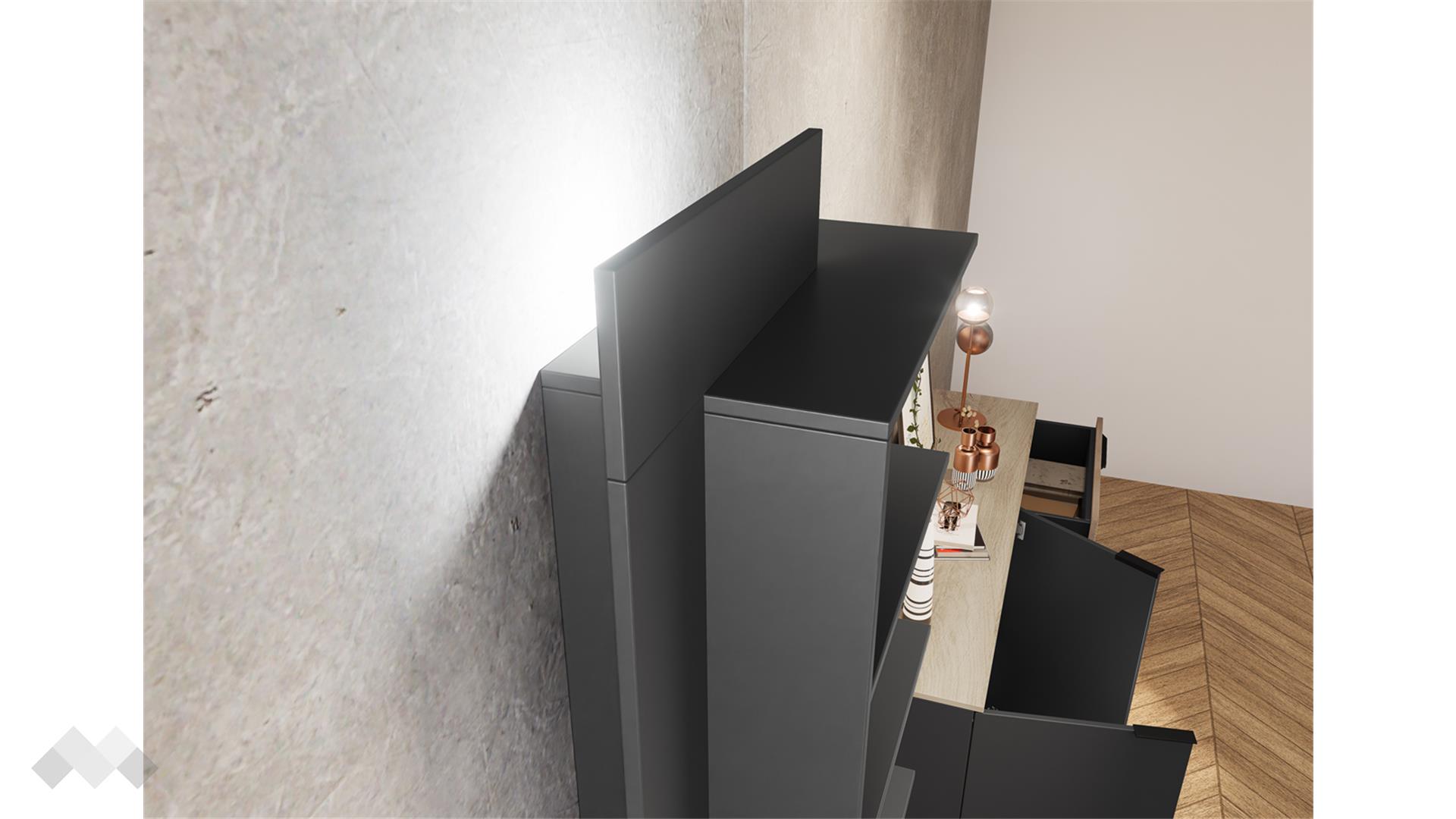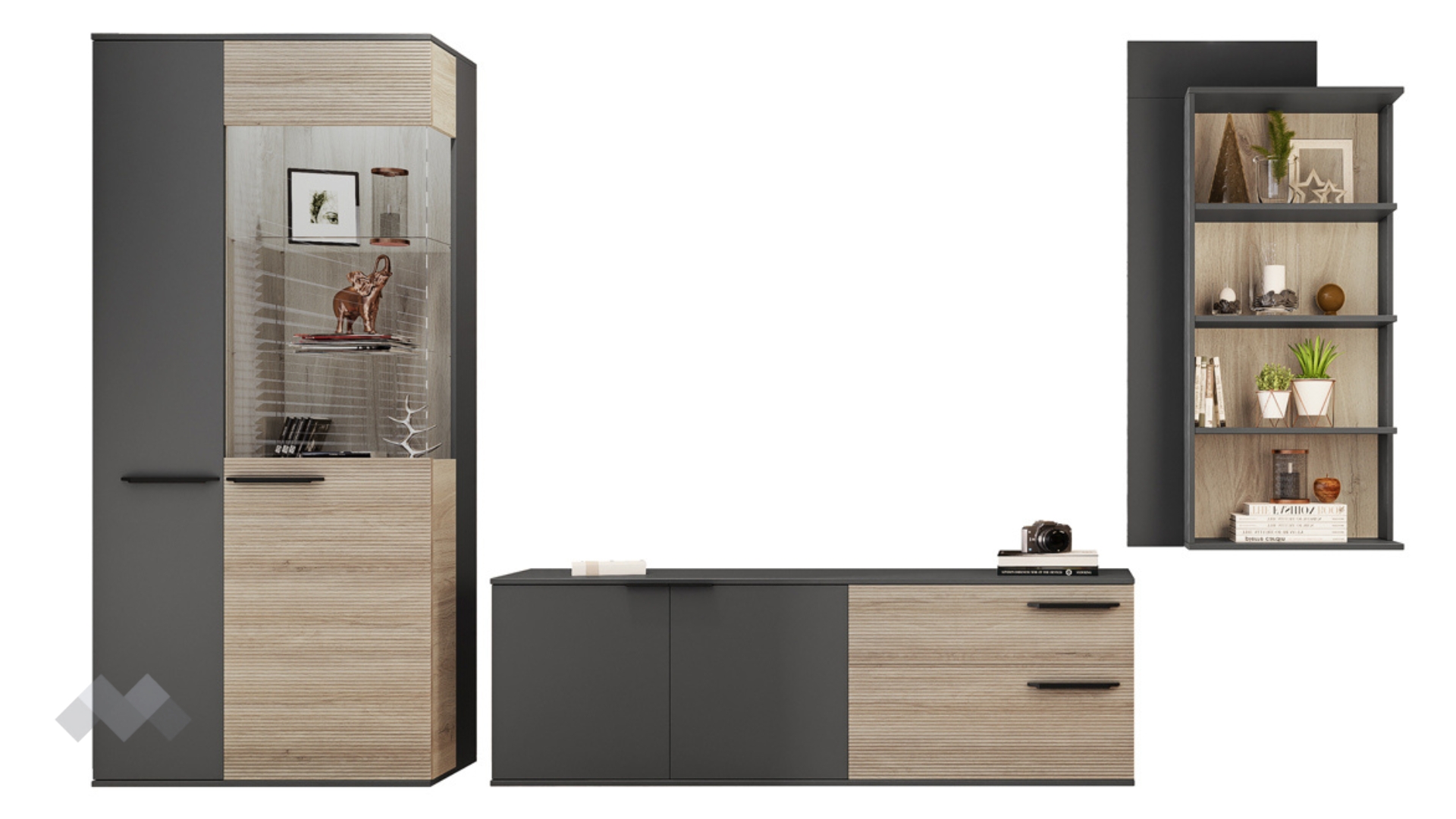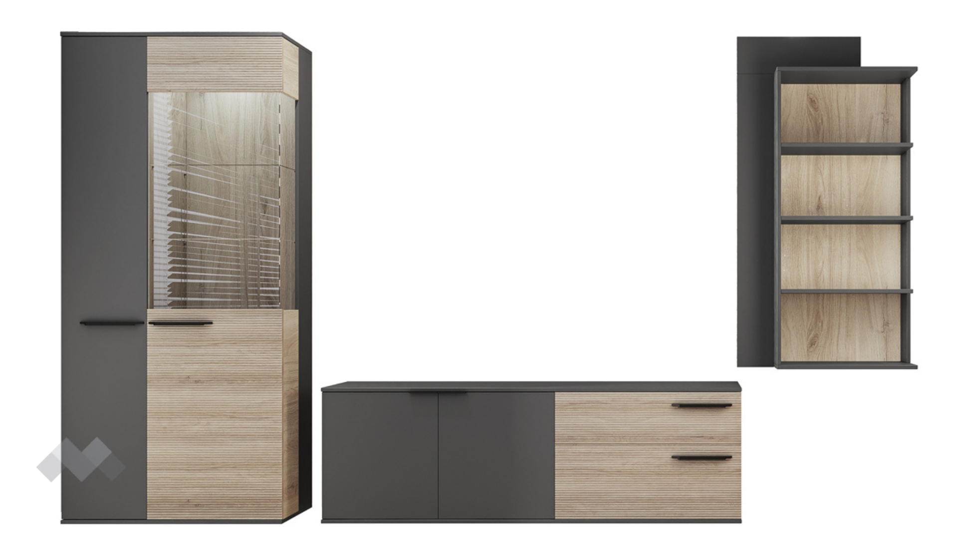 Цветовата комбинация, в която се предлага секция Амрен носи тенденциите на модерния дизайн. Цвят графит в комбинация със сонома арвен и МДФ сонома, придават неповторима визия и съчетание, което ще накара тази стая да заблести. Релефните декорации допълнително подчертават атмосферата на въздействащия и елегантен интериор.