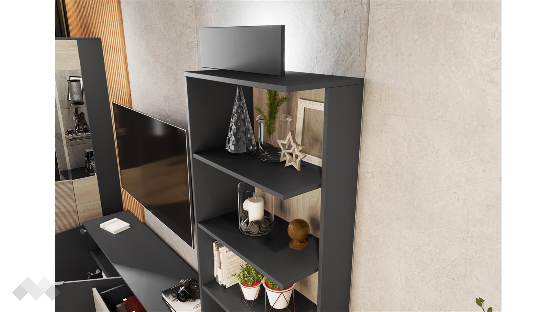 Разполагаш и с елегантна етажерка с пет отворени рафта. На нея можеш да поставиш красивите декорации, които ще подчертаят хармоничната атмосфера в хола и ще засилят усещането за естетика и красота в дома ти.