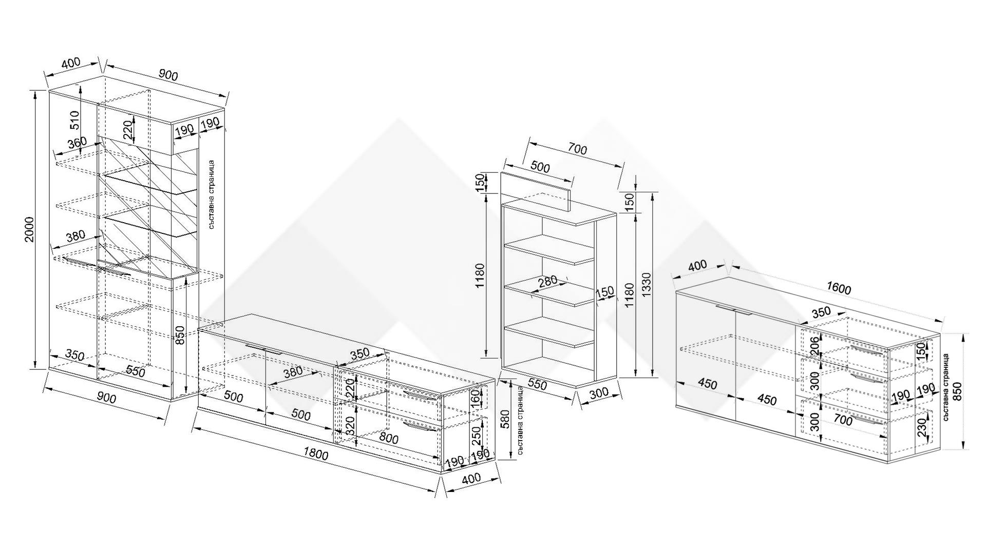 Мебелите са изработени от 16 мм. ПДЧ в комбинация с 18 мм МДФ, което гарантира здравина, стабилност и дълъг период на експлоатация.