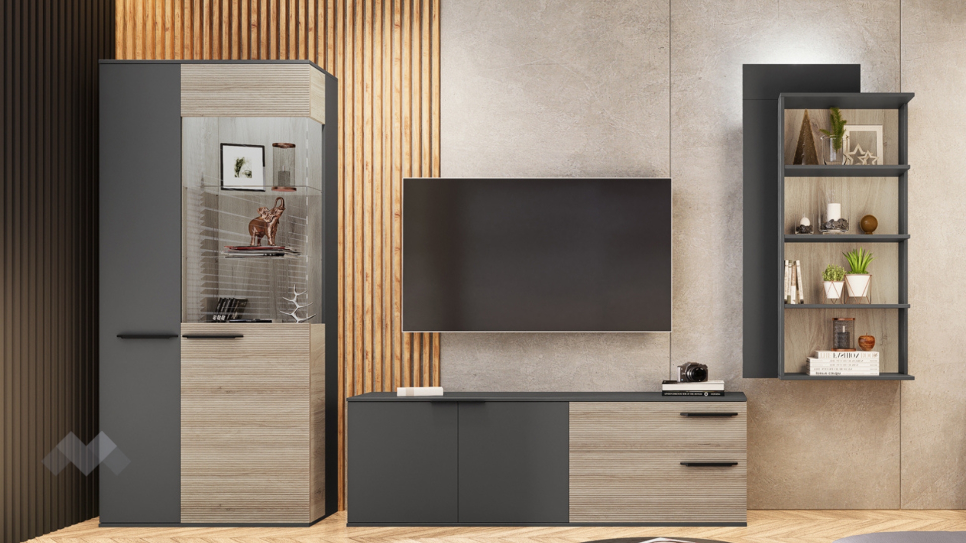 ⭐ Предимства: ✓ 18 мм МДФ ✓ 16 мм ПДЧ ✓ шкаф с витрина ✓ ТВ шкаф с място за телевизор 180/133 см ✓ функционална етажерка ✓ механизъм за плавно затваряне ✓ модерен дизайн ✓ с монтаж към стена ✓ качествена изработка