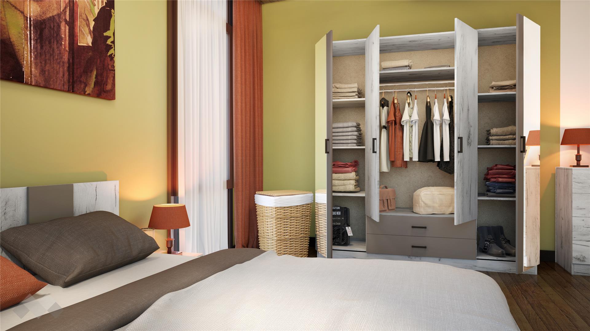 Гардеробът ще те изненада с впечатляващ вътрешен обем и отлично разпределение, в него с лекота ще организираш и подредиш всичките си дрехи. В центъра са разположени лост за закачалки, рафт над нея и две чекмеджета, удобни за съхранение на бельо, чорапи, аксесоари или по-фини дрехи. Страничните крила са разделени с три широки рафта. Това, което ще ти допадне най-много, са двете големи огледала на гардероба, които са неотменен помощник в избора на тоалет всеки ден и освен това правят стаята по-светла.