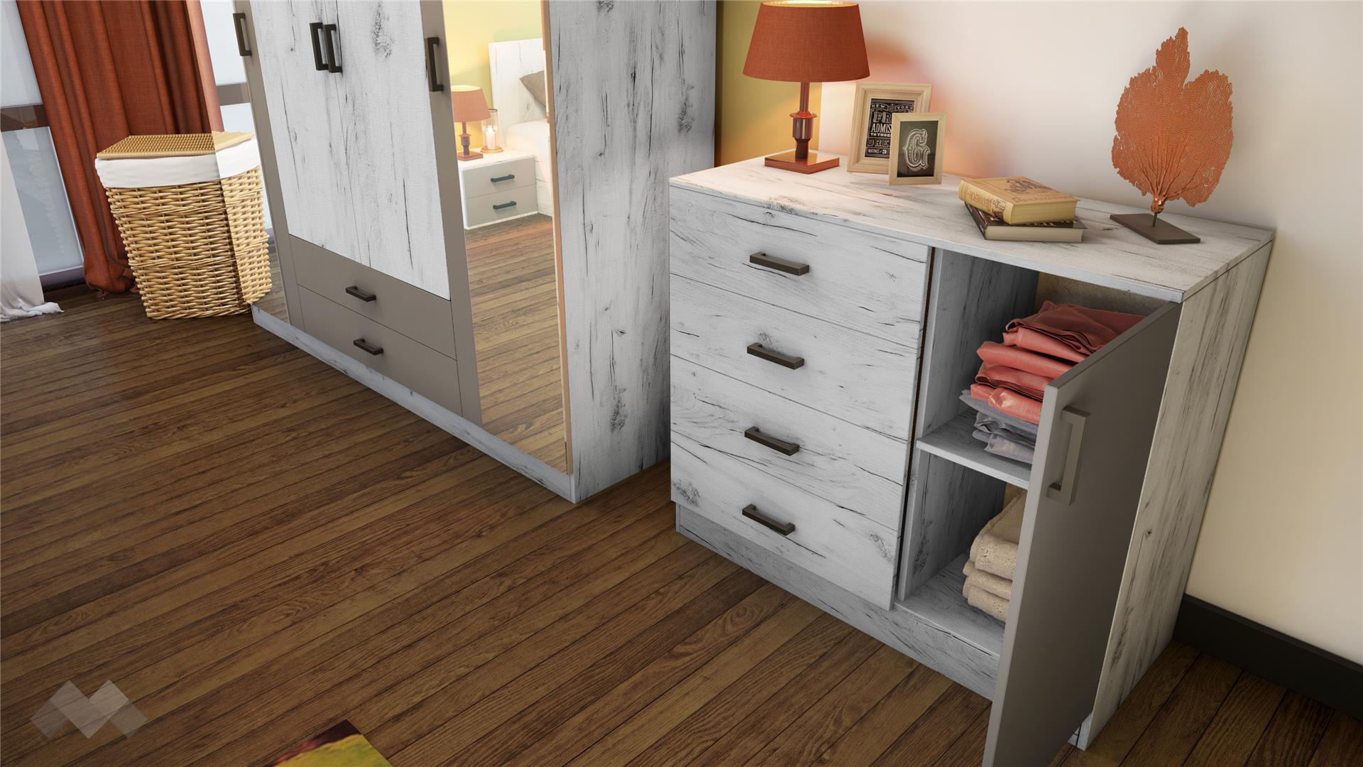 Спален комплект Анастасия е допълнен със семпъл и много функционален скрин, предлагащ ти четири чекмеджета, в които може да прибереш бельо, чорапи, аксесоари или по-фини дрехи. Шкафът разполага с рафт, там може да съхраниш по-обемни вещи или малки ел. уреди. Скринът може да използваш като ТВ шкаф или тоалетка.
