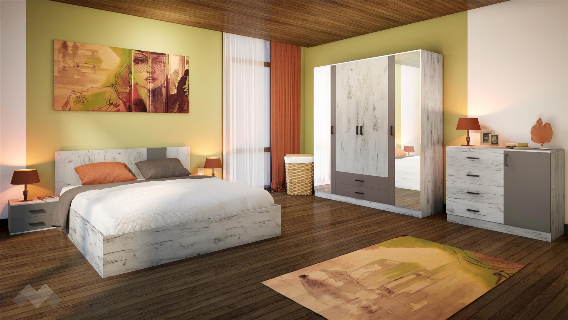 Спалнята е достатъчно голяма, за да ти предостави нужното пространство и комфорт на спане. Таблата ѝ е изпълнена в цвят дъб крафт бял и е ефектно декорирана с акцент в цвят базалт. Двете нощни шкафчета разполагат с по две удобни чекмеджета. Те са перфектното място за кокетна нощна лампа, любимата книга, фотография или място да поставиш мобилния, за да е винаги под ръка, когато ти потрябва.