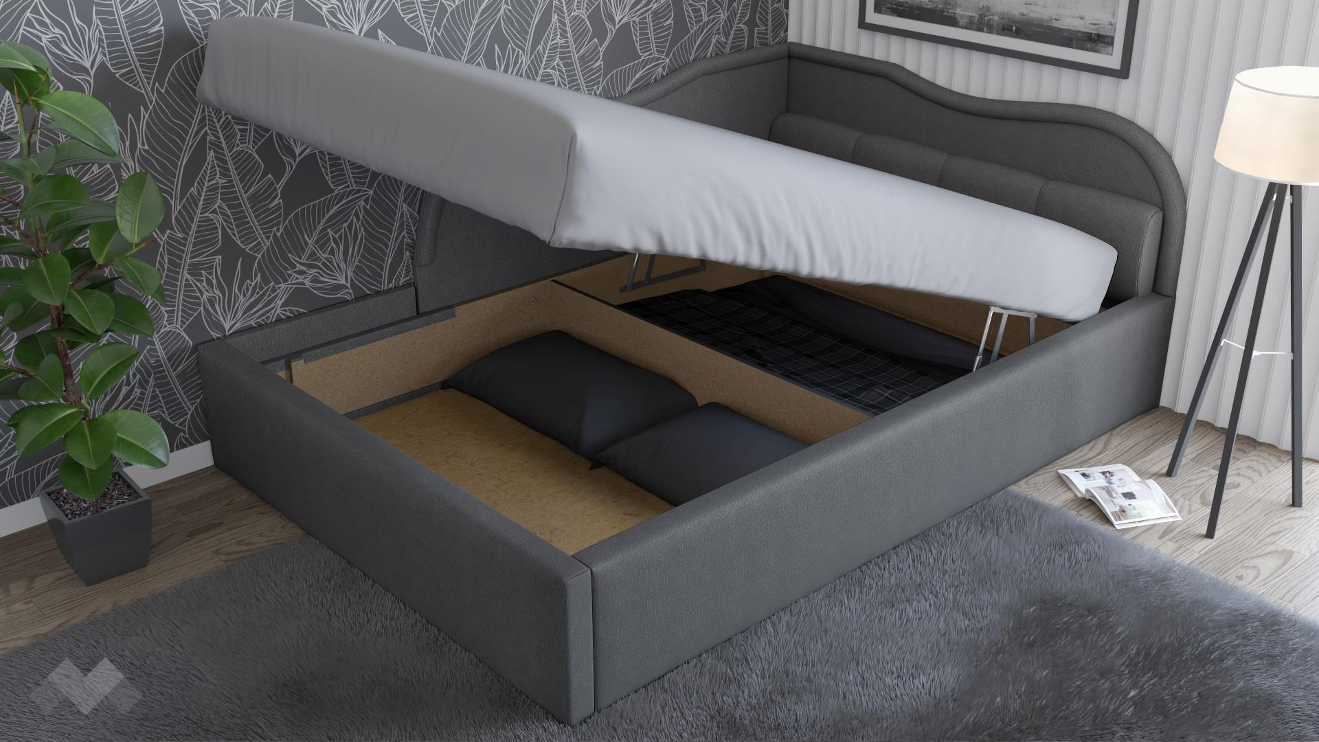 Леглото е с меки форми и елегантен дизайн. Подходящо е за матрак 140/200 см. Под матрака се открива широко пространство, готово да побере всички възглавници и завивки, на които все не намираш място. Така не се налага да закупуваш допълнителни шкафове у дома и пестиш пространство и пари.