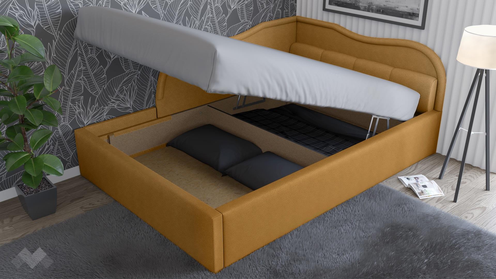 Леглото е с меки форми и елегантен дизайн. Подходящо е за матрак 140/200 см. Под матрака се открива широко пространство, готово да побере всички възглавници и завивки, на които все не намираш място. Така не се налага да закупуваш допълнителни шкафове у дома и пестиш пространство и пари.