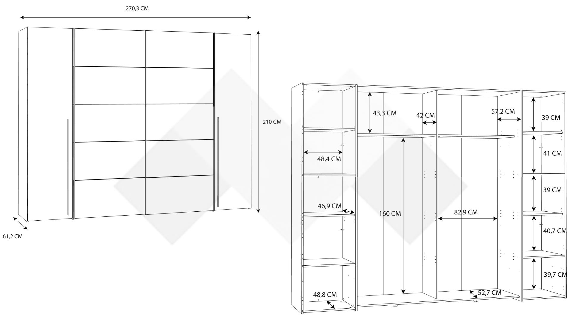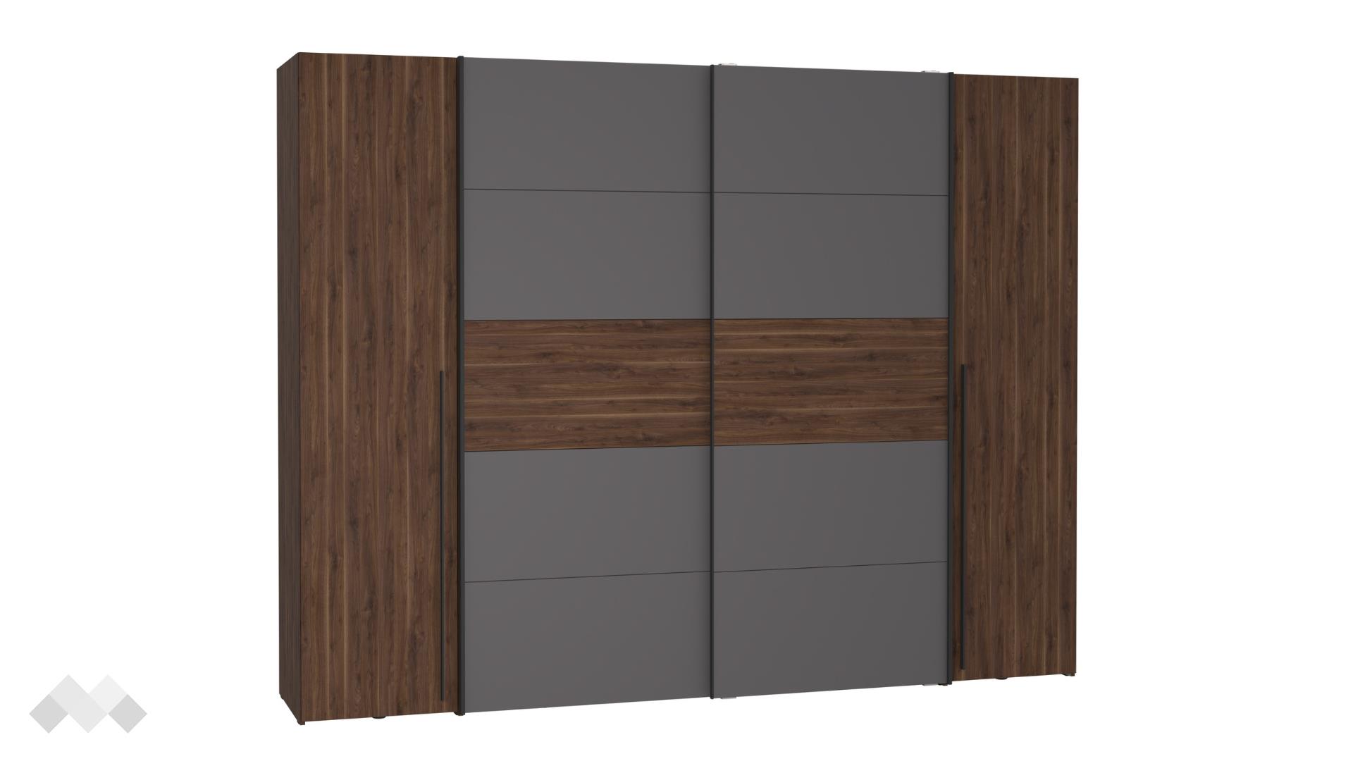 Гардеробът комбинира плъзгащи и стандартни врати, предлагайки практично решение за съхранение и удобен достъп до вещите. Със своя четирикрилен дизайн и внушителни размери, той е подходящ за просторни спални и помещения, в които подредбата и стилът вървят ръка за ръка.