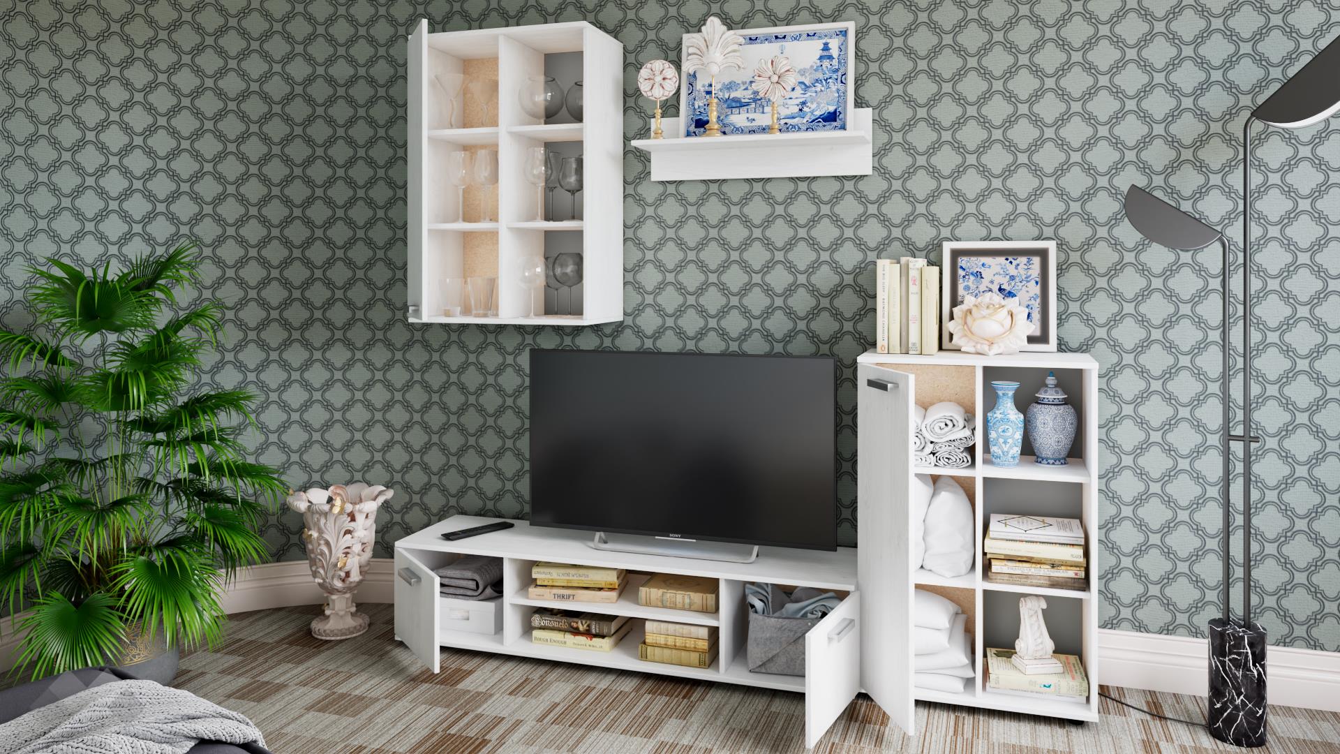 Основата на секцията представлява широк ТВ шкаф с удобен плот, два отворени рафта под него и два шкафа. Там ще откриеш достатъчно място, където да поставиш цялата си съпътстваща техника като ТВ приемници, DVD плейъри и други. До него е поставен висок шкаф с открити рафтове и врата, където с лекота ще аранжираш необходимите ти в ежедневието вещи. Окаченият шкаф също ще ти е от полза – освен да подредиш сувенири, фотоси и декорации, можеш да се възползваш и от закритата част, където да организираш дребни ел. уреди или неща, които да останат скрити от погледите. Към секцията сме добавили и практична етажерка, подходяща за подреждане на книги, скъпи спомени като фотографии или сувенири, а можеш и да аранжираш със стилни декорации и украси – изборът е твой!