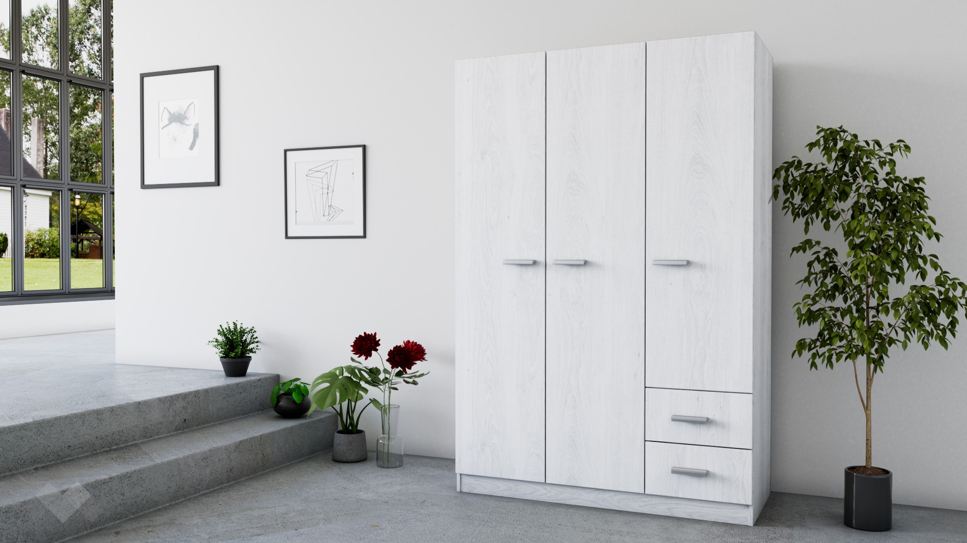 ⭐ Предимства: ✓ трикрилен ✓ 2 чекмеджета ✓ 3 рафта ✓ лост за закачалки ✓ модерен декор ✓ практично разпределение ✓ качествена изработка ✓ 16 мм ПДЧ