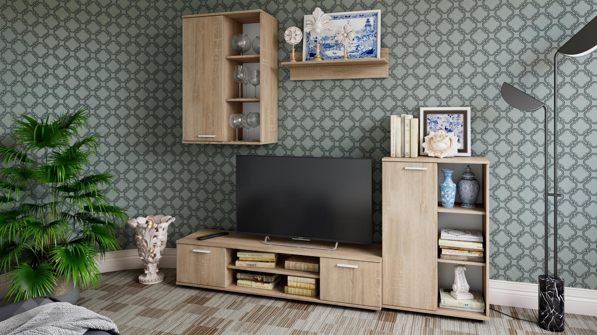 Основата на секцията представлява широк ТВ шкаф с удобен плот, два отворени рафта под него и два шкафа. Там ще откриеш достатъчно място, където да поставиш цялата си съпътстваща техника като ТВ приемници, DVD плейъри и други. До него е поставен висок шкаф с открити рафтове и врата, където с лекота ще аранжираш необходимите ти в ежедневието вещи. Окаченият шкаф също ще ти е от полза – освен да подредиш сувенири, фотоси и декорации, можеш да се възползваш и от закритата част, където да организираш дребни ел. уреди или неща, които да останат скрити от погледите. Към секцията сме добавили и практична етажерка, подходяща за подреждане на книги, скъпи спомени като фотографии или сувенири, а можеш и да аранжираш със стилни декорации и украси – изборът е твой!