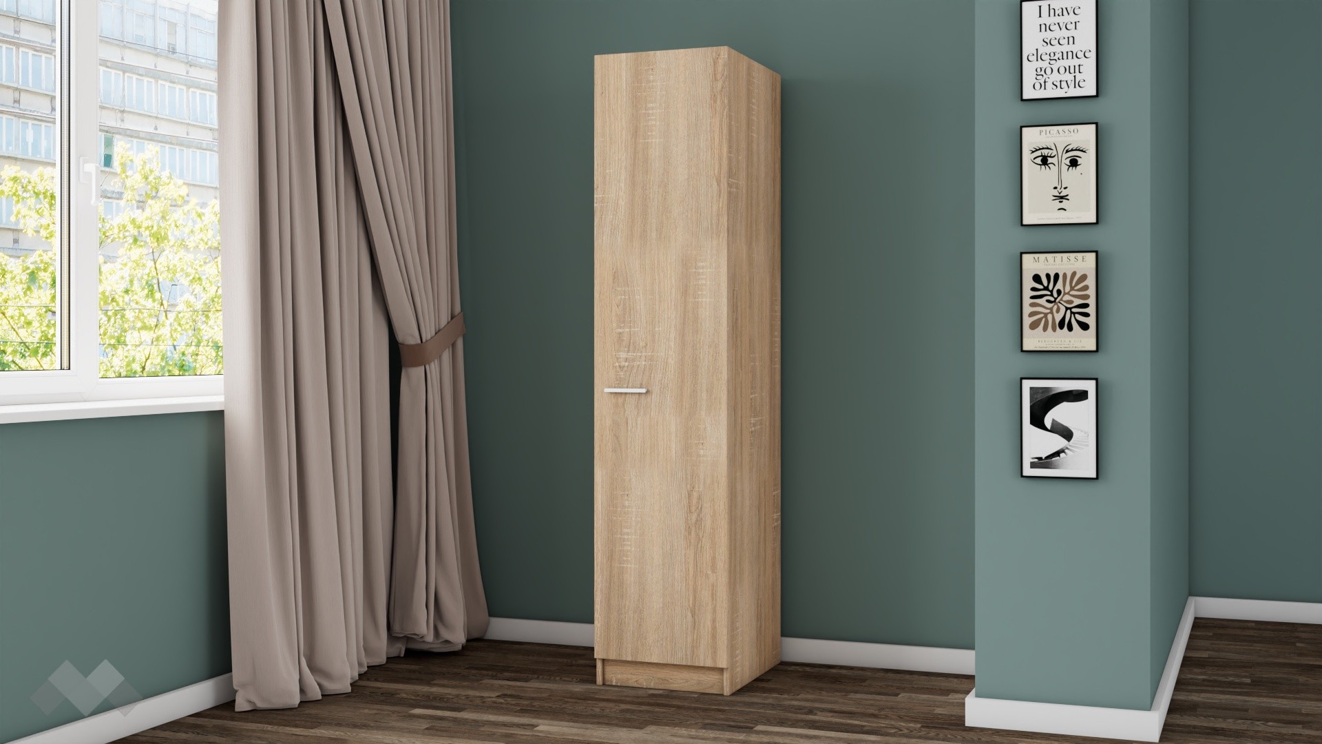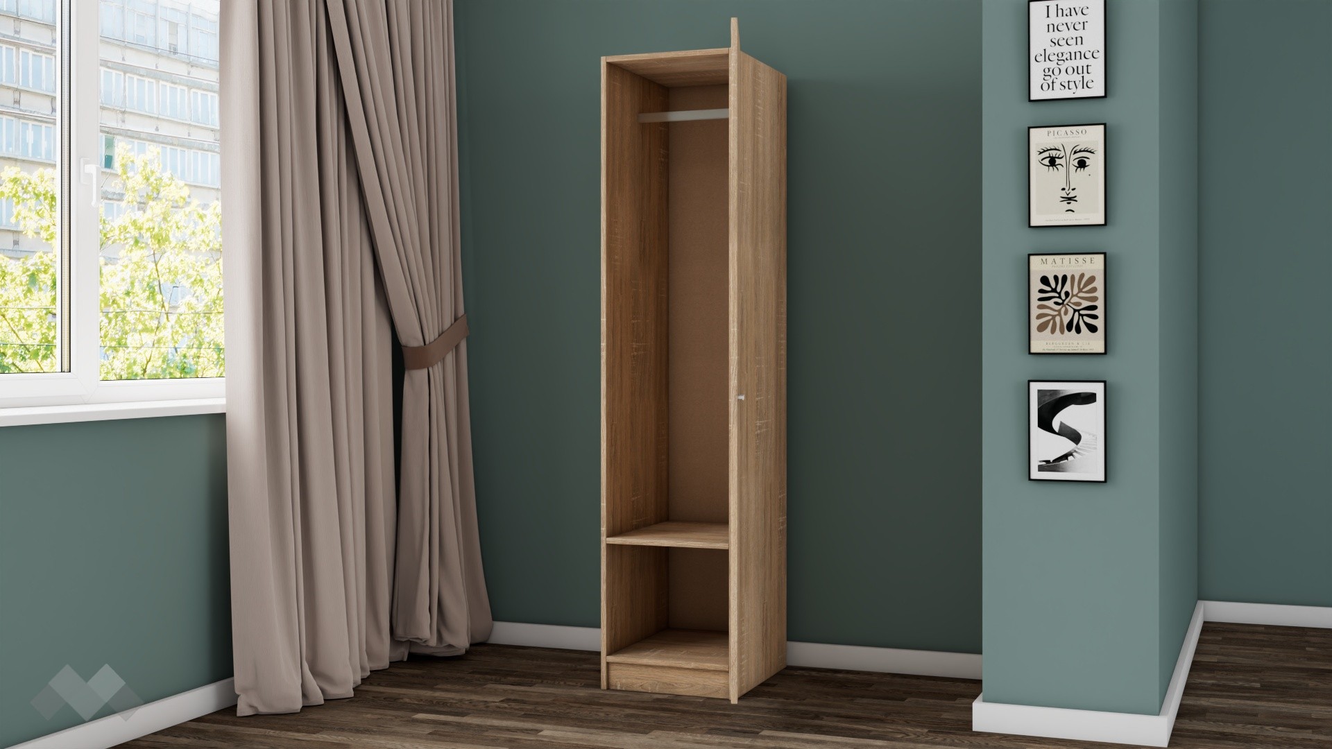 Еднокрилен гардероб Арго е практично и стилно решение за организиране на дрехи и аксесоари в по-малки пространства. Със своя изчистен и компактен дизайн този гардероб лесно се вписва в различни интериори и е особено подходящ за антре, спалня или детска стая.