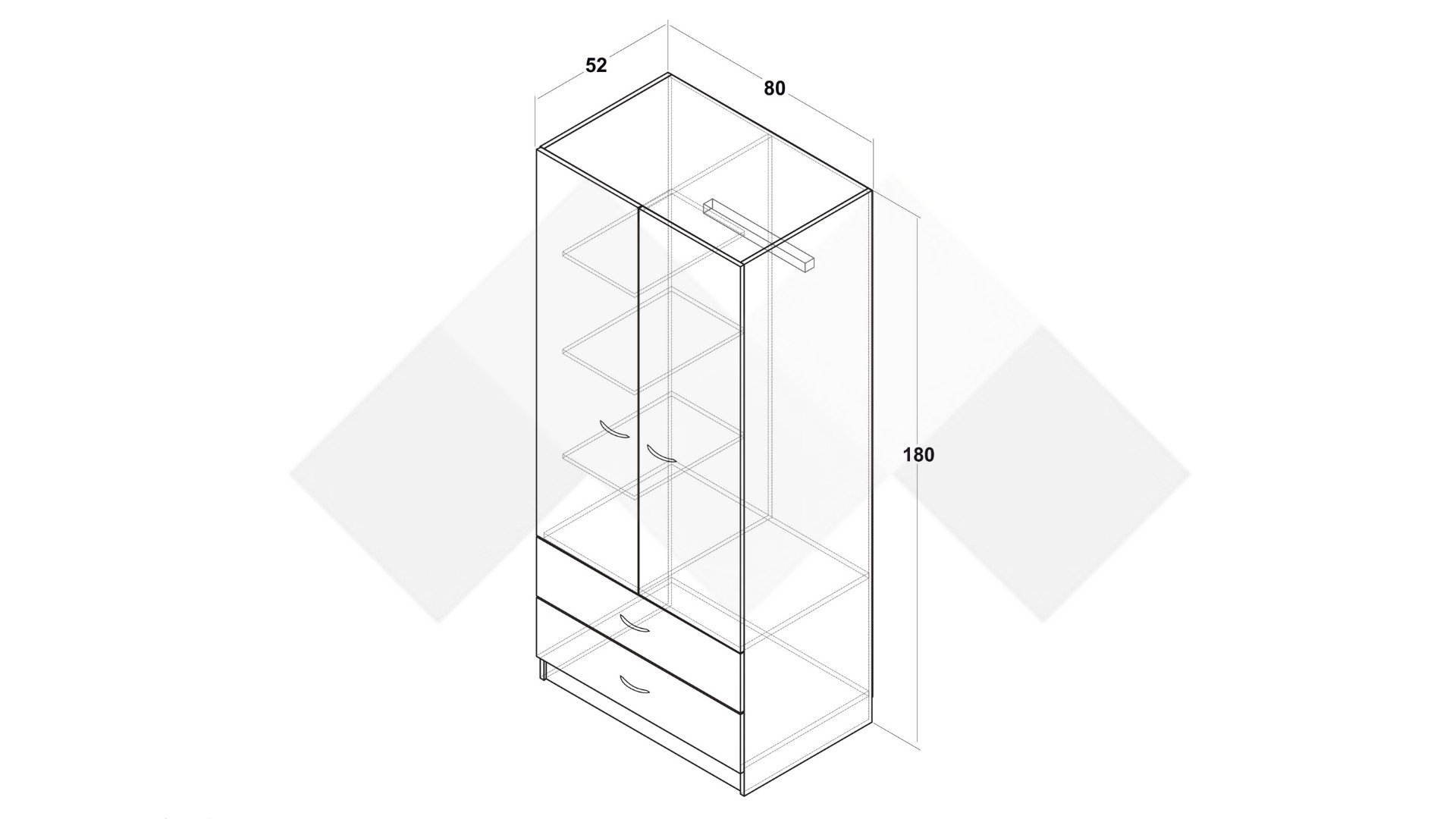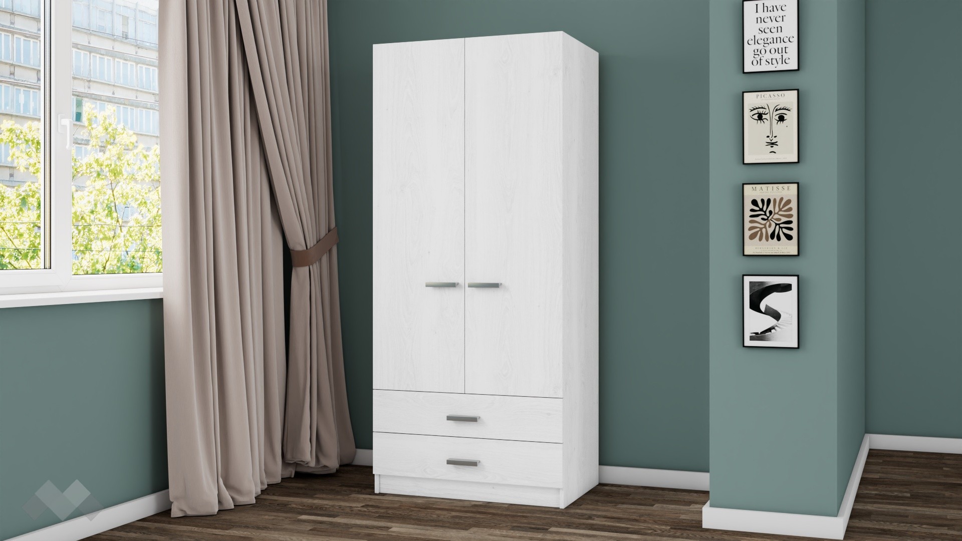 Гардеробът разполага с две врати, зад които е разположен лост за закачалки – идеален за съхранение на дрехи, които изискват окачване. В долната част на гардероба има две просторни чекмеджета, подходящи за сгънати дрехи, спално бельо или аксесоари.