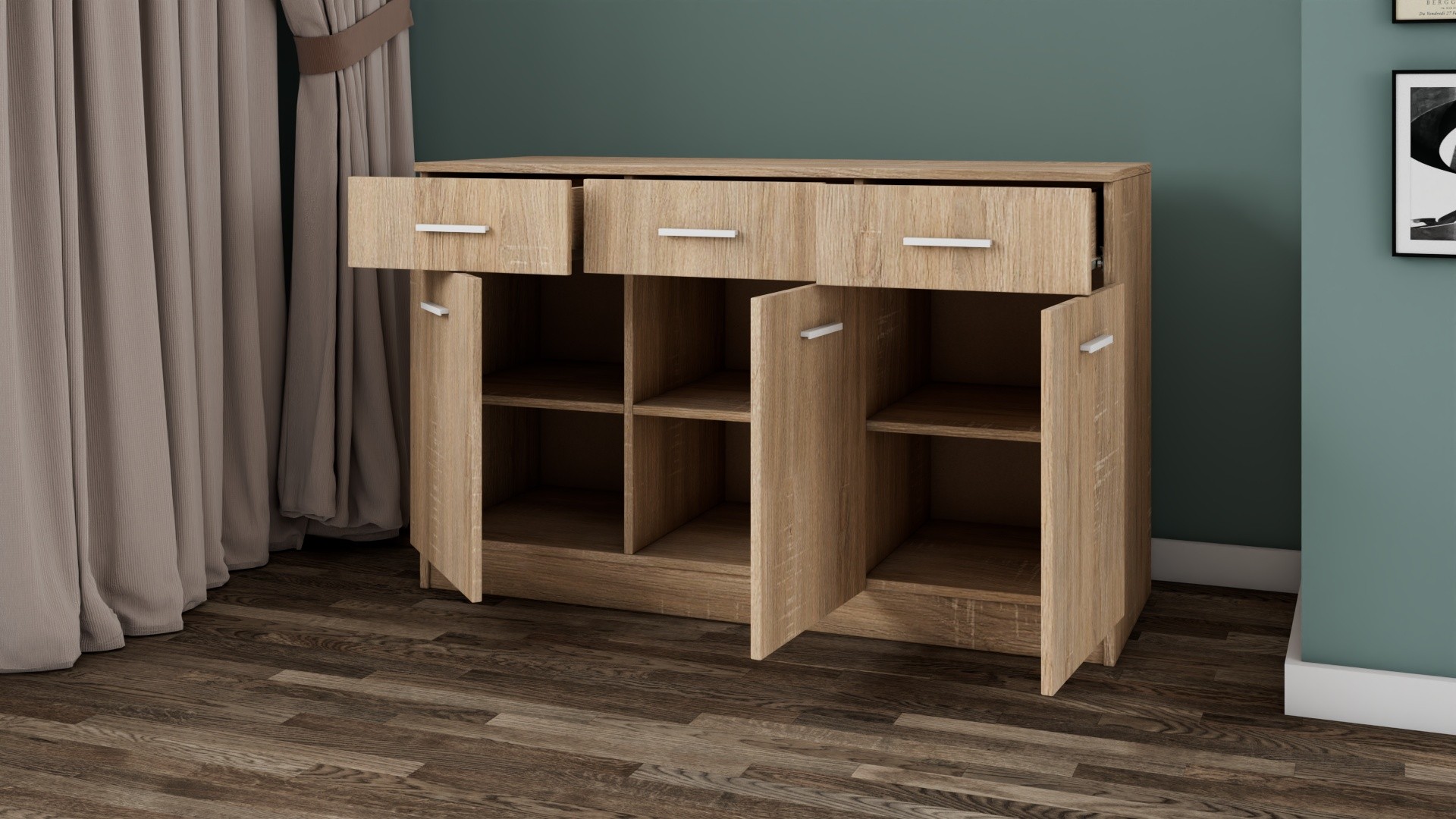 Скринът разполага с три просторни чекмеджета, които предлагат обширно място за съхранение на бельо, аксесоари или други лични вещи. Чекмеджетата се движат плавно и безшумно, осигурявайки лесен достъп до съдържанието им. Трите шкафа с вратички предоставят допълнително пространство за съхранение на дрехи, книги или други предмети, които искаш да бъдат организирани и лесно достъпни. Вътрешните рафтове в шкафовете осигуряват оптимално използване на пространството.