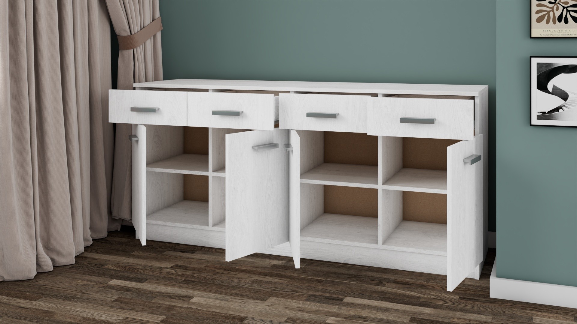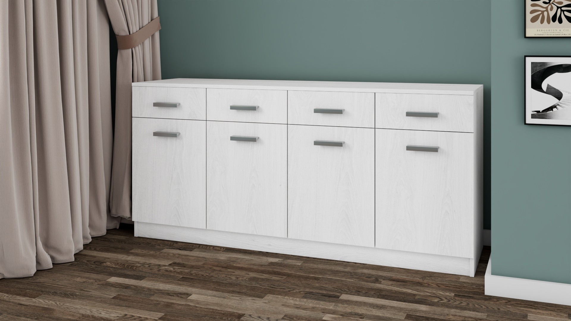 На твое разположение са четири чекмеджета, подходящи за организиране на дрехи, бельо, малки електроуреди, аксесоари или други необходими за теб неща. Четири шкафа за побиране на още вещи. Горният плот можеш да използваш за подреждане на декорации, книги, козметика или други вещи, които искаш да ти бъдат винаги под ръка.