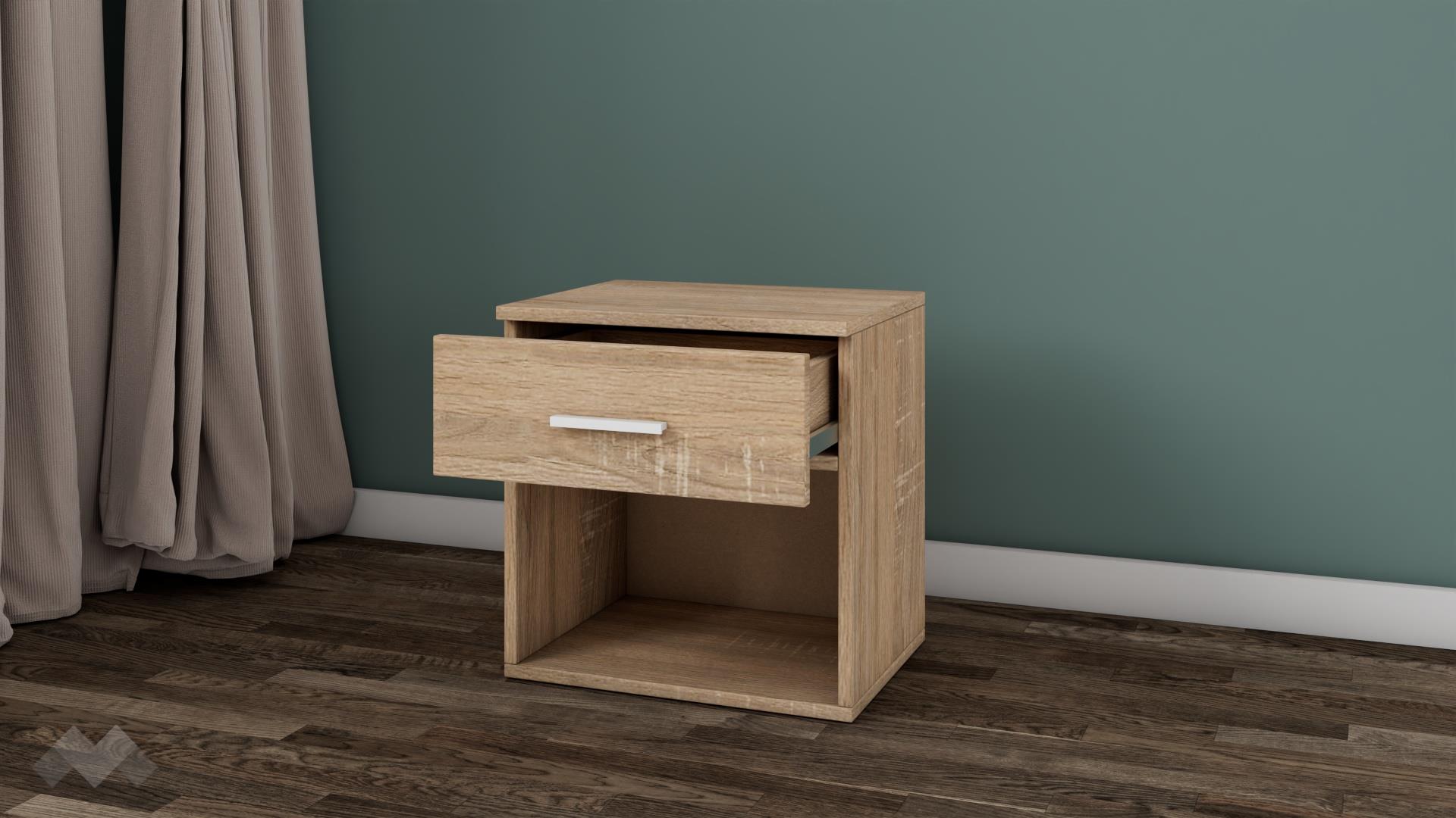 Нощно шкафче Арго е малко, но практично. Благодарение на оптималната му височина, то ще пасне на всяко легло. Чекмеджето и отвореният рафт ти предоставят достатъчно място за съхранение на всички най-необходими вещи, за да са винаги на една ръка разстояние. Върху горния плот можеш да поставиш нощна лампа или книгата, която четеш преди сън.
