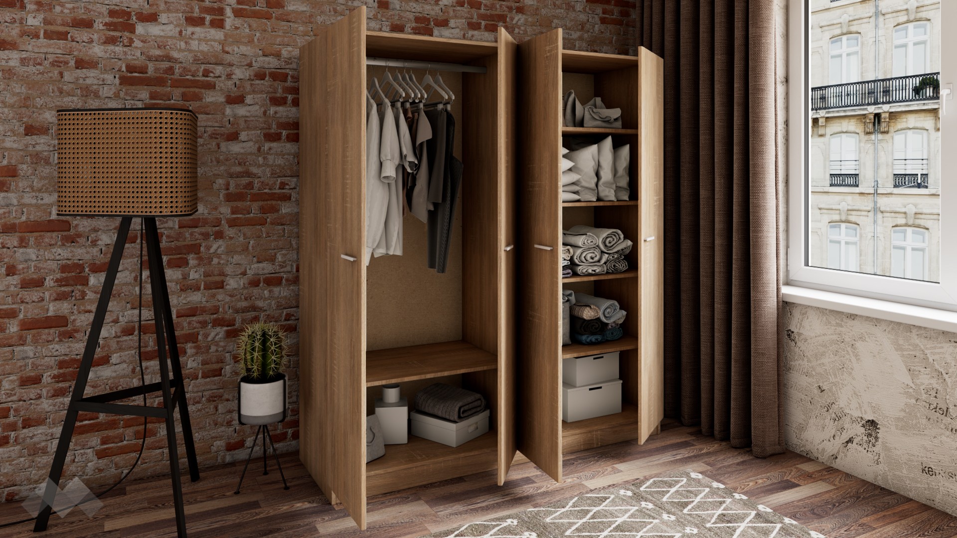 Гардеробът е практично разпределен, изцяло отговарящ на съвременните стандарти за съхранение на дрехи. Вратите се отварят леко и ти дават бърз достъп до всичко – зад две от вратите ще откриеш четири удобно разпределени просторни рафтове, готови да поберат всичките ти дрехи. Не сме забравили и лоста за закачалки, а под него е разположен удобен рафт, където да подредиш аксесоари, кутии за съхранение или други вещи. Така пестиш време и изборът на ежедневен тоалет се превръща в детска игра.
