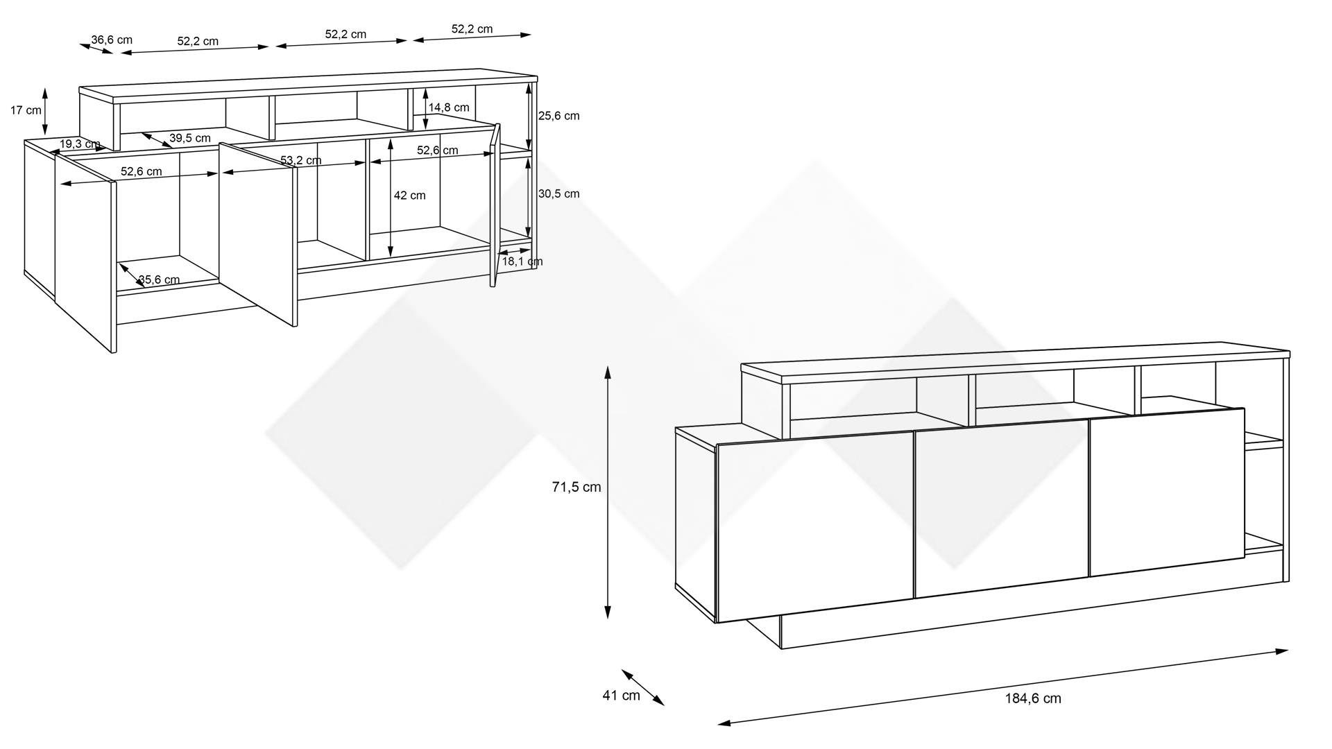 Благодарение на балансирания си дизайн и просторната горна повърхност, шкафът е подходящ за телевизори с различни размери. Семплата визия и функционалното разпределение го правят подходящ избор за модерна дневна или хол.