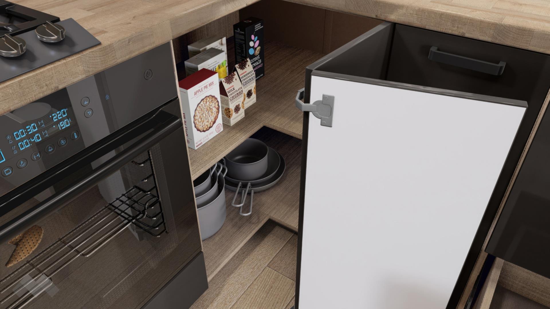 Горният ред шкафове са просторни за най-често използваните уреди и посуда. Шкаф за вграждане на фурна. Долния ред шкафове е функционално подбран - перфектната комбинация на рафтове и чекмеджета, за да поберат често използваните уреди, подправки и посуда. Витринния шкаф е с опушени матови стъкла 4 мм., 4 рафта и LED осветление, за да изглежда още по-елегантно.