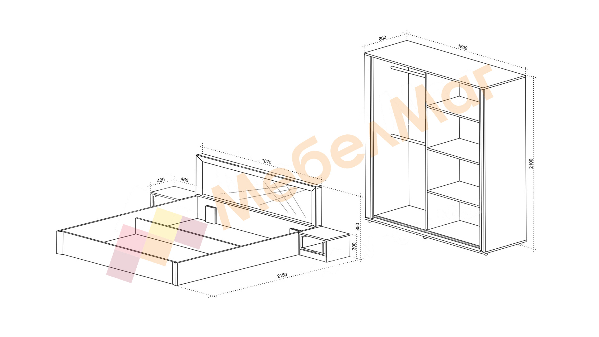 ✓ модерен дизайн ✓ гардероб с огледало ✓ 2 нощни шкафчета ✓ LED осветление ✓ включен повдигащ механизъм с дъно ✓ 16 мм ПДЧ