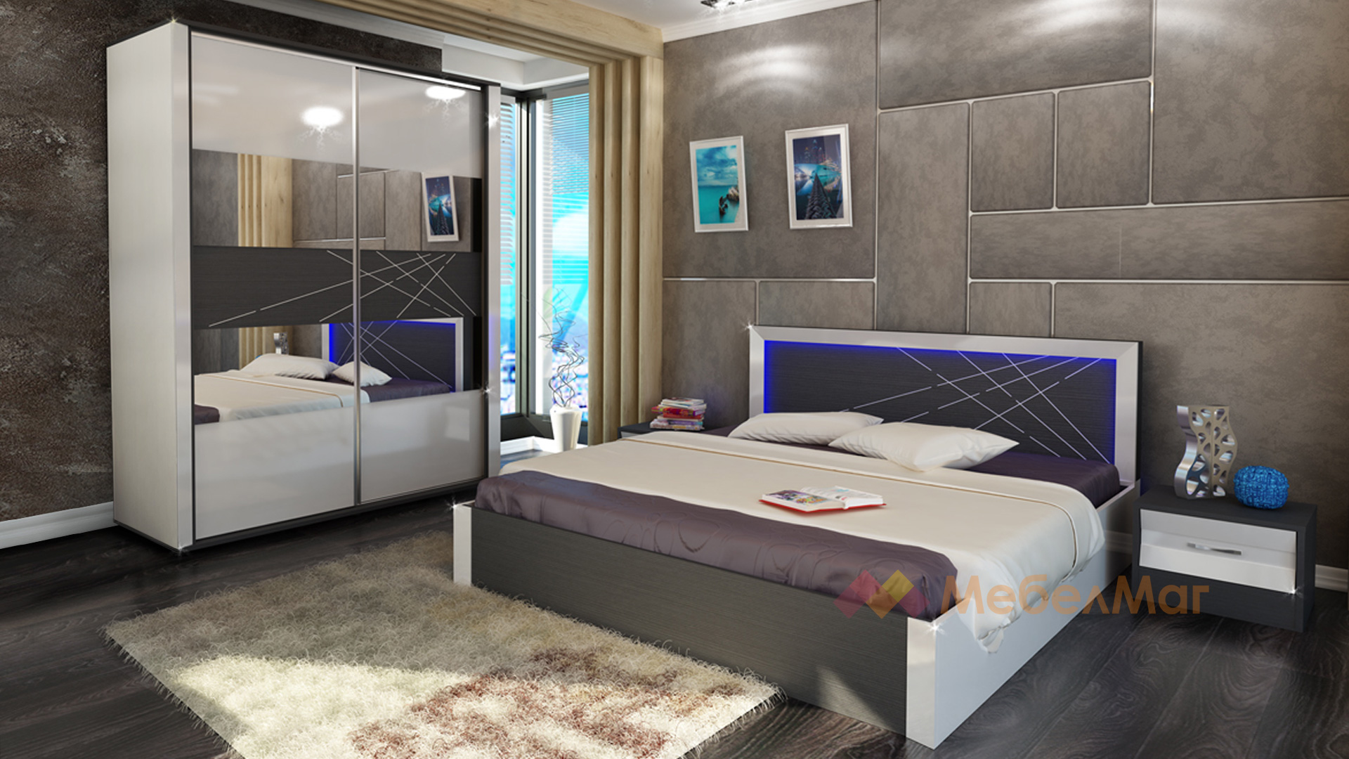 Спалнята на този комплект е едно светещо бижу. По цялото протежение под белия MDF профил е монтирано RGB LED осветление. Този тип осветление се доставя с дистанционно управление, посредством което сменяш цвета на осветлението в желания от теб цвят. Осветлението е акцентно, за да не пречи по време на сън, в същото време дискретно осветява твоята спалня. Осветлението се отразява в модерните гравюри на таблата. Спалнята е подходяща за матрак с размер 160/200 см.
