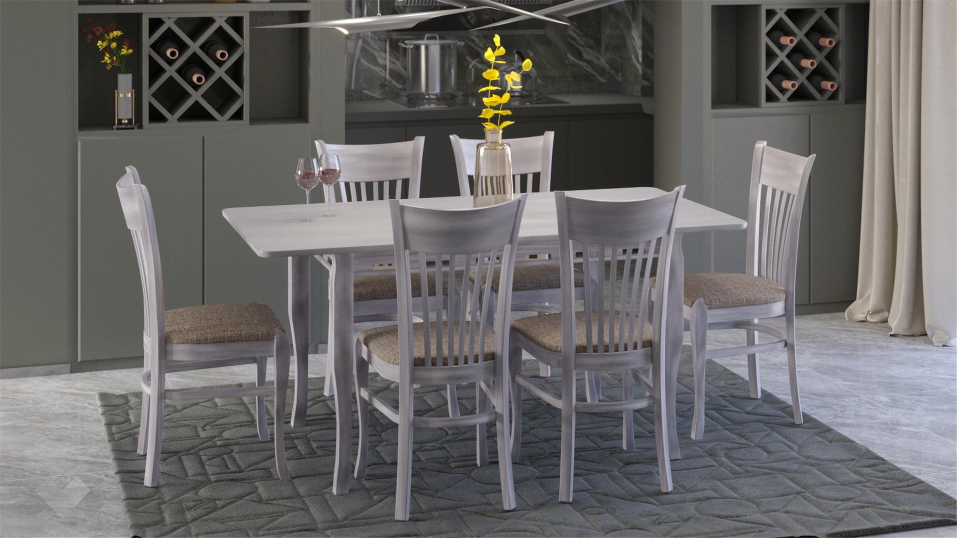 Столът е със здрава конструкция от естествена букова дървесина за устойчивост и стабилност, а лаковото покритие добавя елегантност. Седалката е проектирана с твърда основа, тапицирана с дунапрен за повече комфорт при седене и завършена със здрава текстилна дамаска, лесна за поддръжка.