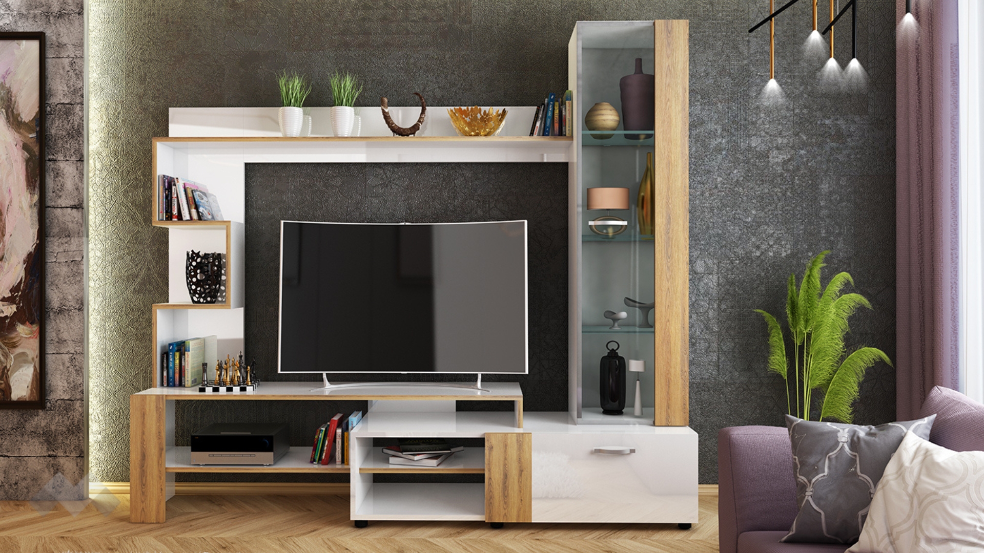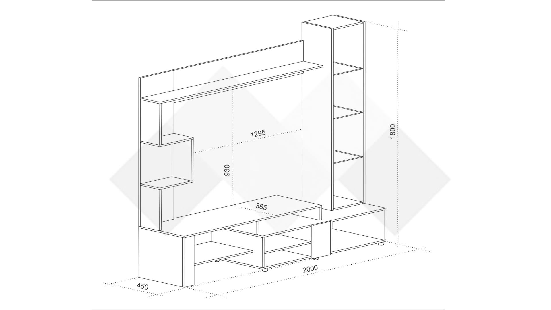ТВ шкафът е съставен от няколко отворени пространства, където да подредиш всичките си ТВ приемници или друга техника, така те винаги ще са ти под ръка. Предлага се с етажерка, която започва от ТВ шкафа и продължава по височината на секцията.