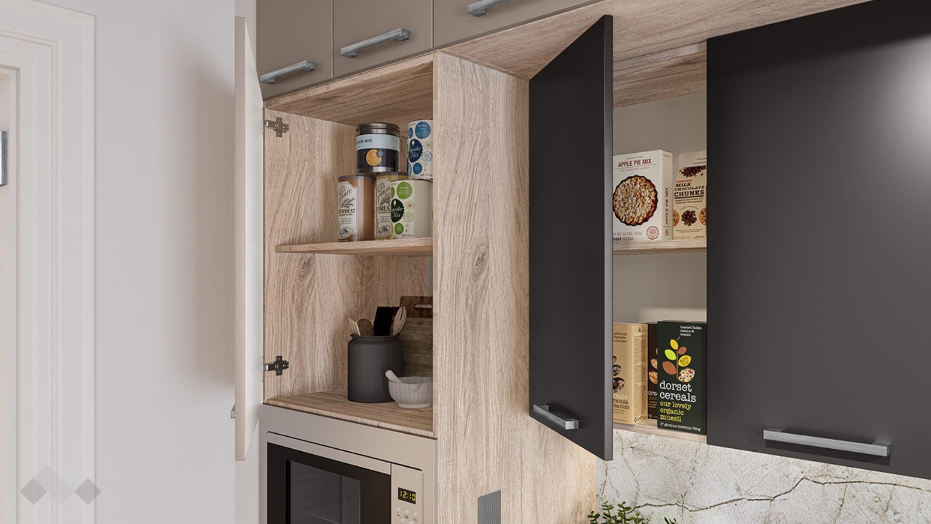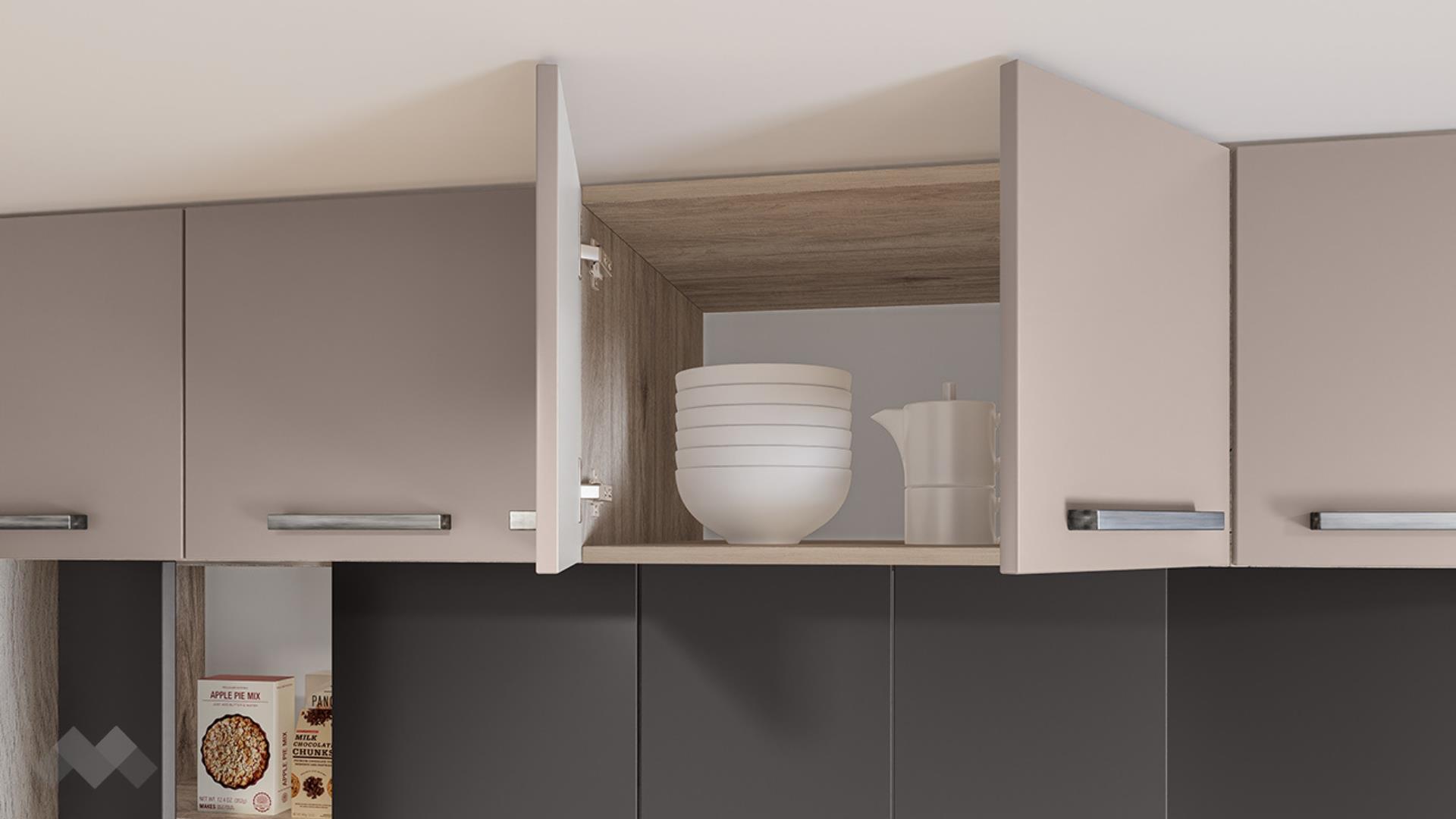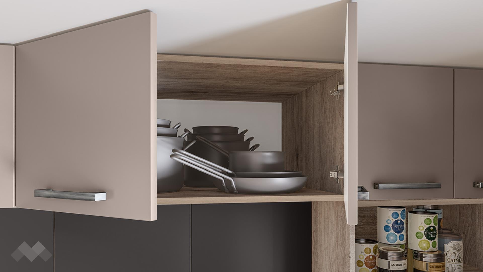 Горния ред шкафове са удобни и функционални - побират малко изполваните уреди и съдове. Основния ред горни шкафове са просторни за най-често използваните уреди и посуда. Шкаф стандартен размер за вграждане на хладилник - за да бъде всичко в синхрон. Шкаф за вграждане на фурна и микровълнова. Долния ред шкафове е функционално подбран - перфектната комбинация на рафтове и чекмеджета, за да поберат често използваните уреди, подправки и посуда.
