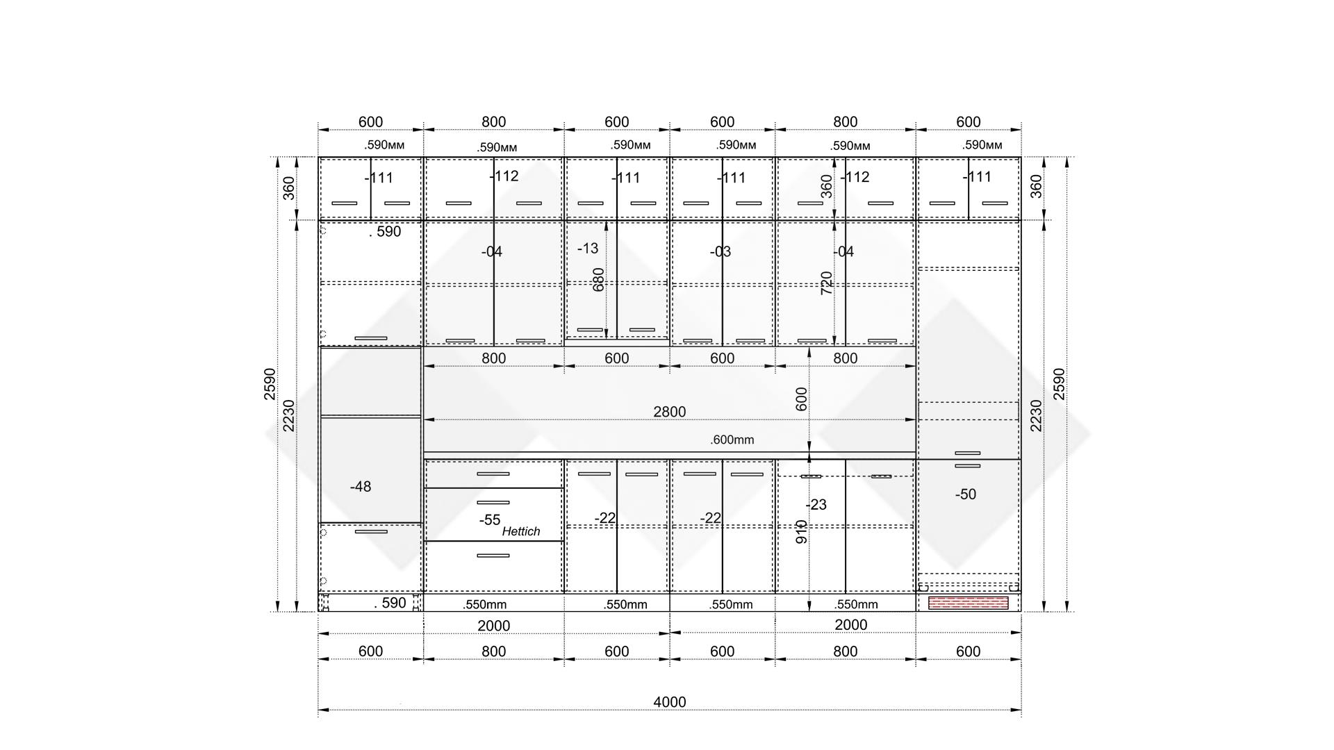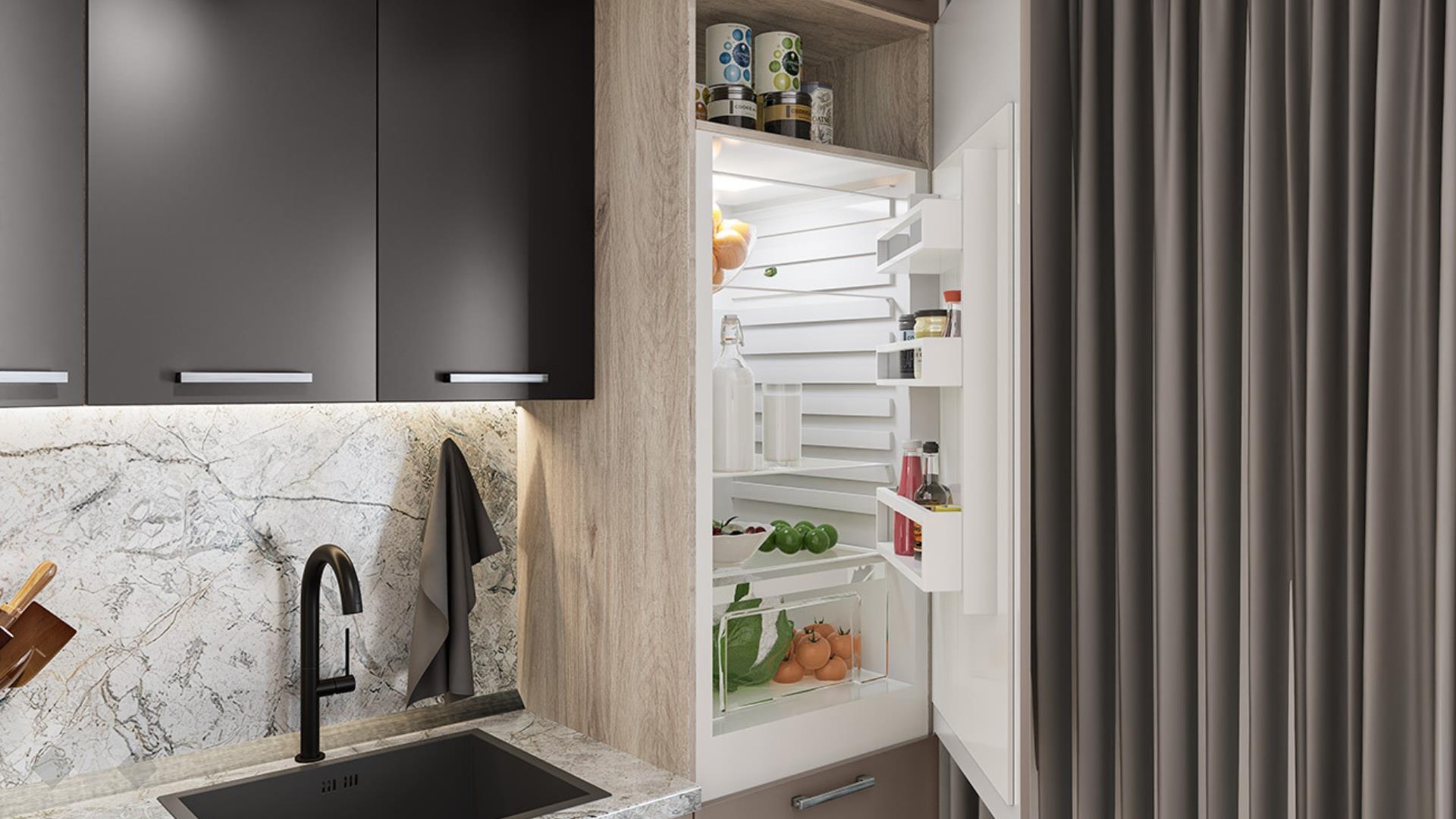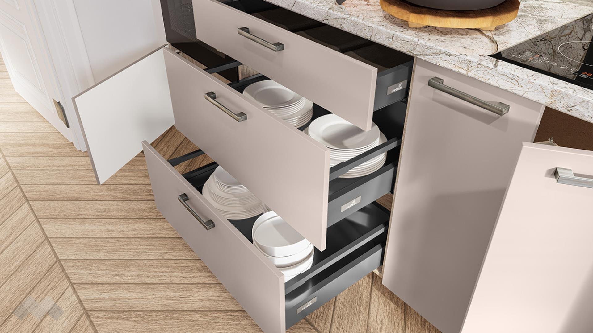 Горния ред шкафове са удобни и функционални - побират малко изполваните уреди и съдове. Основния ред горни шкафове са просторни за най-често използваните уреди и посуда. Шкаф стандартен размер за вграждане на хладилник - за да бъде всичко в синхрон. Шкаф за вграждане на фурна и микровълнова. Долния ред шкафове е функционално подбран - перфектната комбинация на рафтове и чекмеджета, за да поберат често използваните уреди, подправки и посуда.