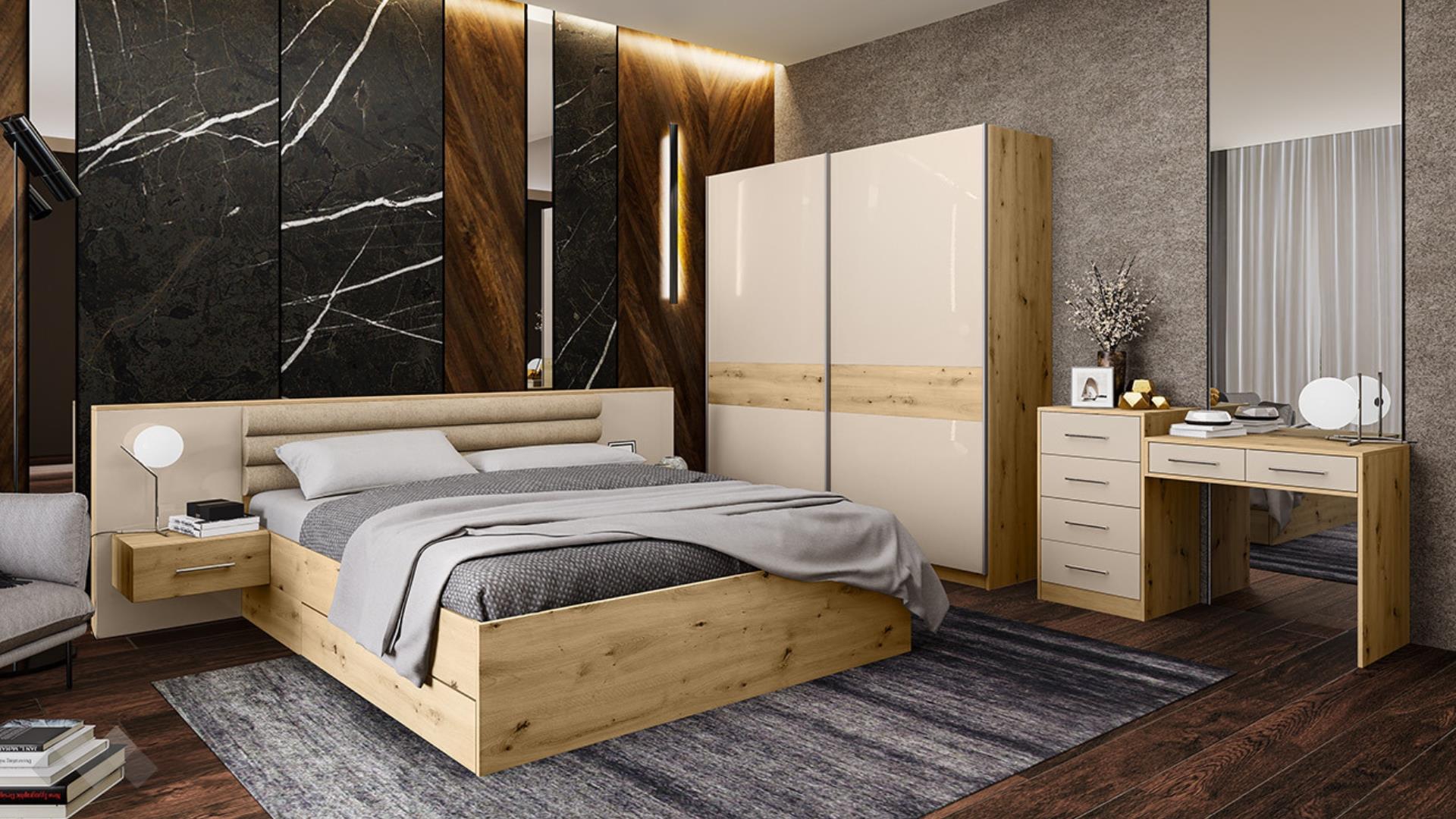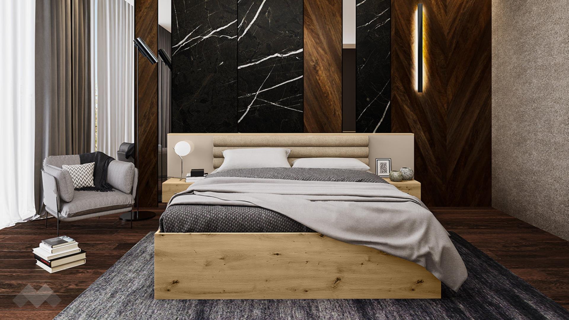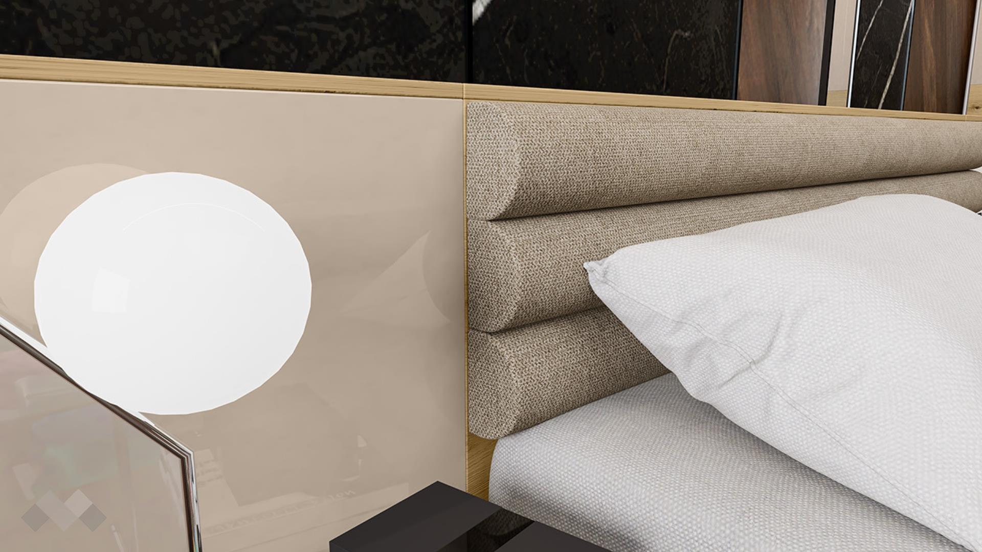 ⭐ Предимства: ✓ спалня с тапицирана табла ✓ 2 нощни шкафчета ✓ елегантен дизайн ✓ качествена изработка ✓ 16 мм ПДЧ ✓ 16 мм МДФ