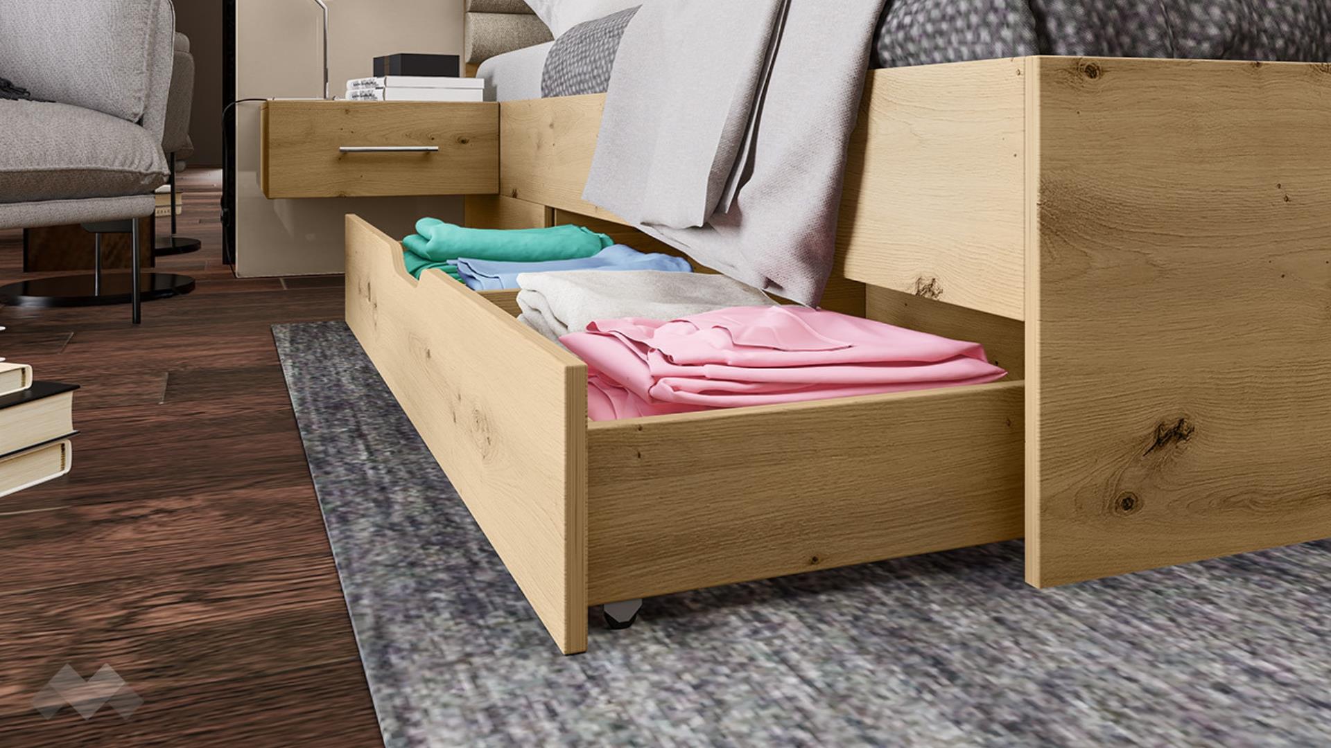 Най-важното нещо във всяка спалня е удобното легло, на което да отпочинеш след дълъг ден. Затова ние ти предлагаме спалня Бедфорд. Тя е голяма и удобна – за матрак с размер 160/200 см. Предимството, което ще оцениш са вградените чекмеджета в конструкцията на самото легло. Само с едно издърпване, пред теб се открива пространство, което да побере спално бельо, завивки или друг вещи.  Това е безценно предимство при по-малките жилища, където всеки сантиметър е от значение.