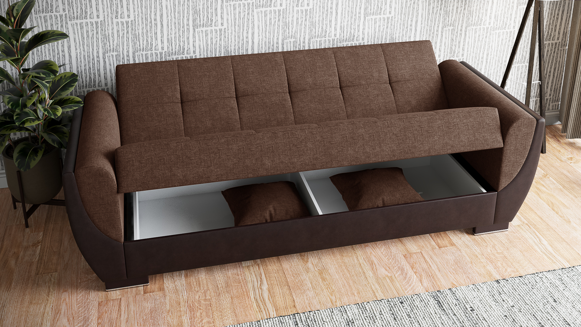 Конструкцията е от бонел пружина, която гарантира оптимална опора и устойчивост във времето. Диванът разполага и с ракла за съхранение – идеално място за спално бельо, завивки или други вещи, които искаш да държиш под ръка, но скрити от погледа.