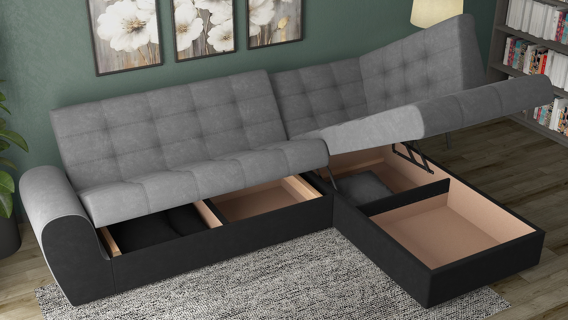 Ъглов диван Белла S съчетава стил, комфорт и изключителна практичност – перфектен избор за съвременния дом. Благодарение на своя клик-клак механизъм, диванът лесно се трансформира в удобно легло, което го прави отлично решение както за всекидневна почивка, така и за гости.