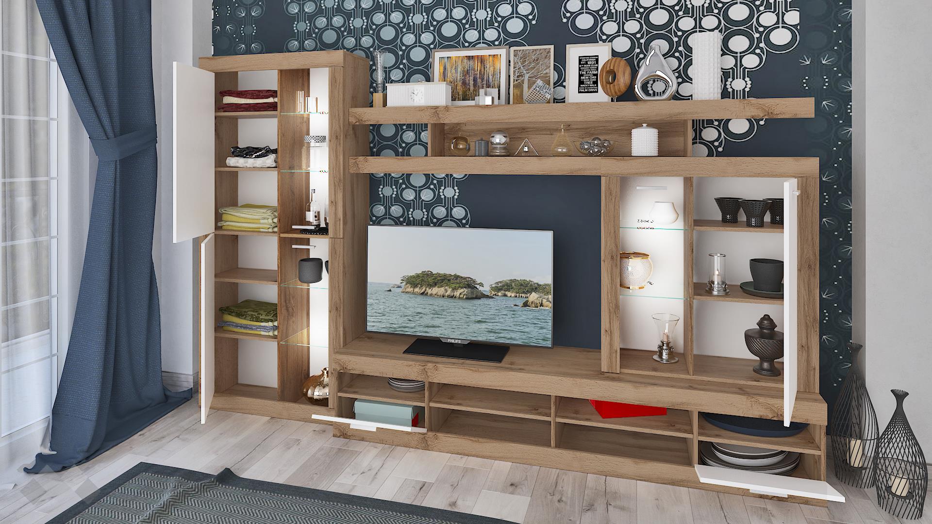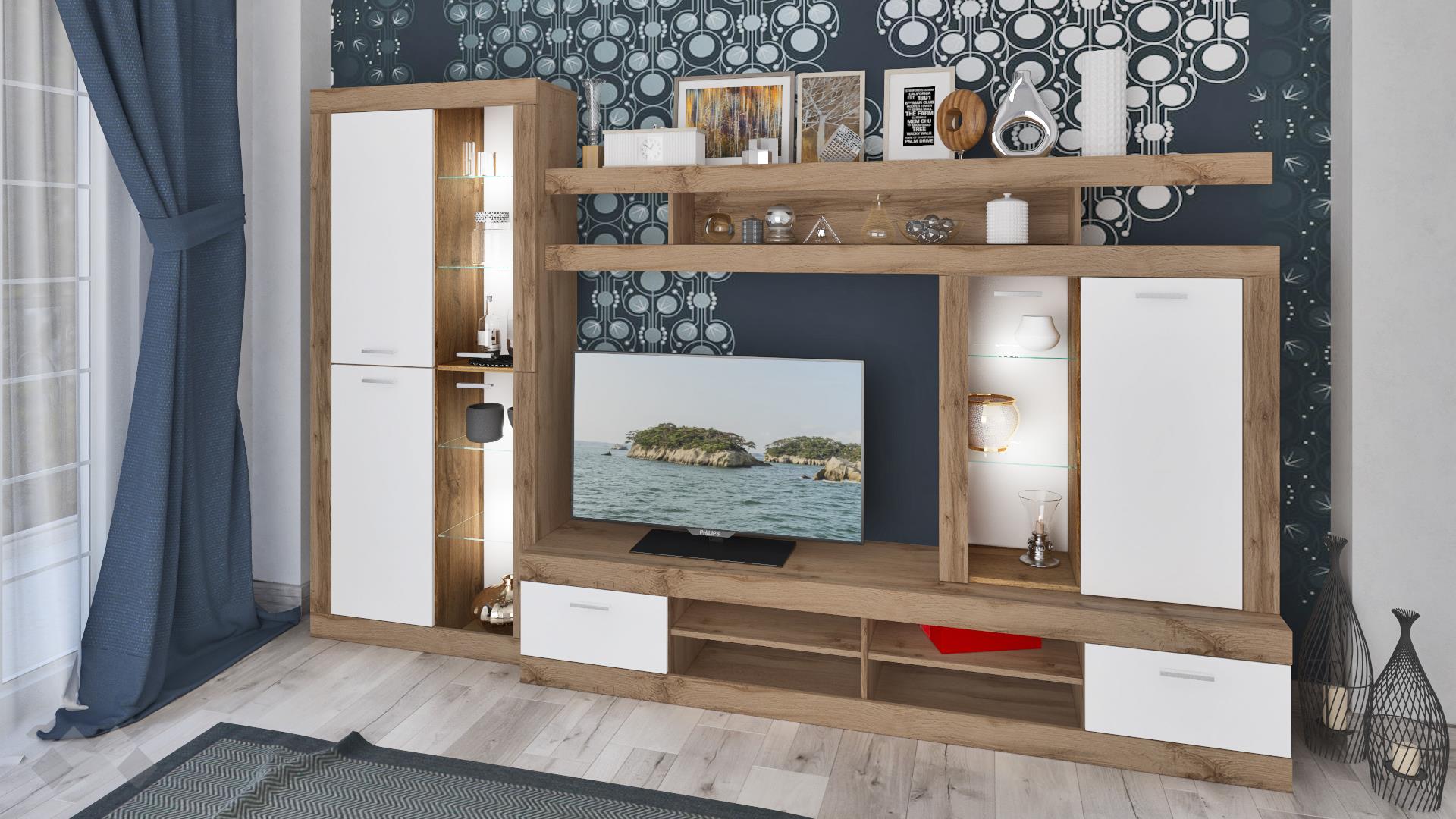 ТВ шкафът разполага с четири отворени ниши и два шкафа с падащи вратички. Там ще откриеш достатъчно място за цялата си съпътстваща техника като ТВ приемници, DVD плейъри, конзоли и други. Над него ще видиш затворен шкаф с два рафта и витрина, където можеш да подредиш любимите си сувенири или сервизите, които използваш най-често. Високият шкаф се състои от два затворени шкафа и две витрини.