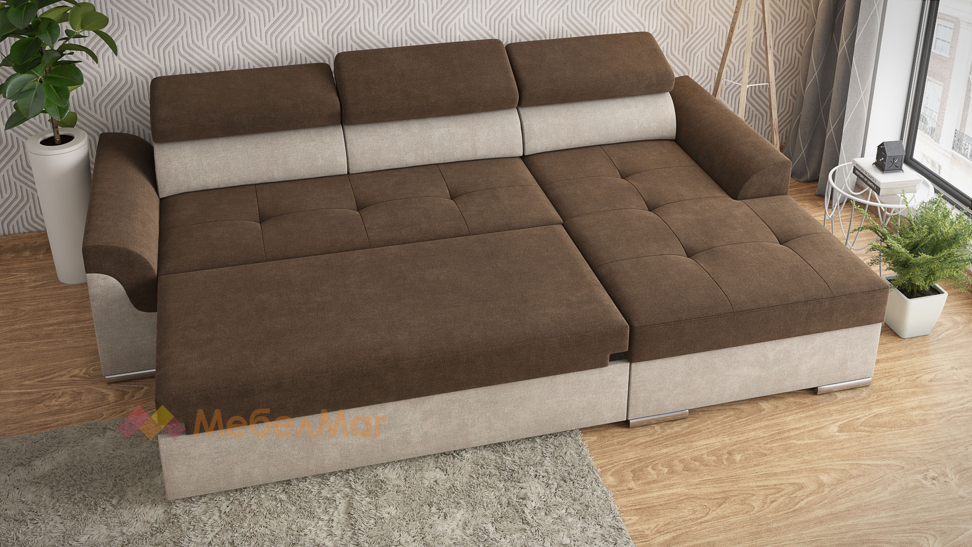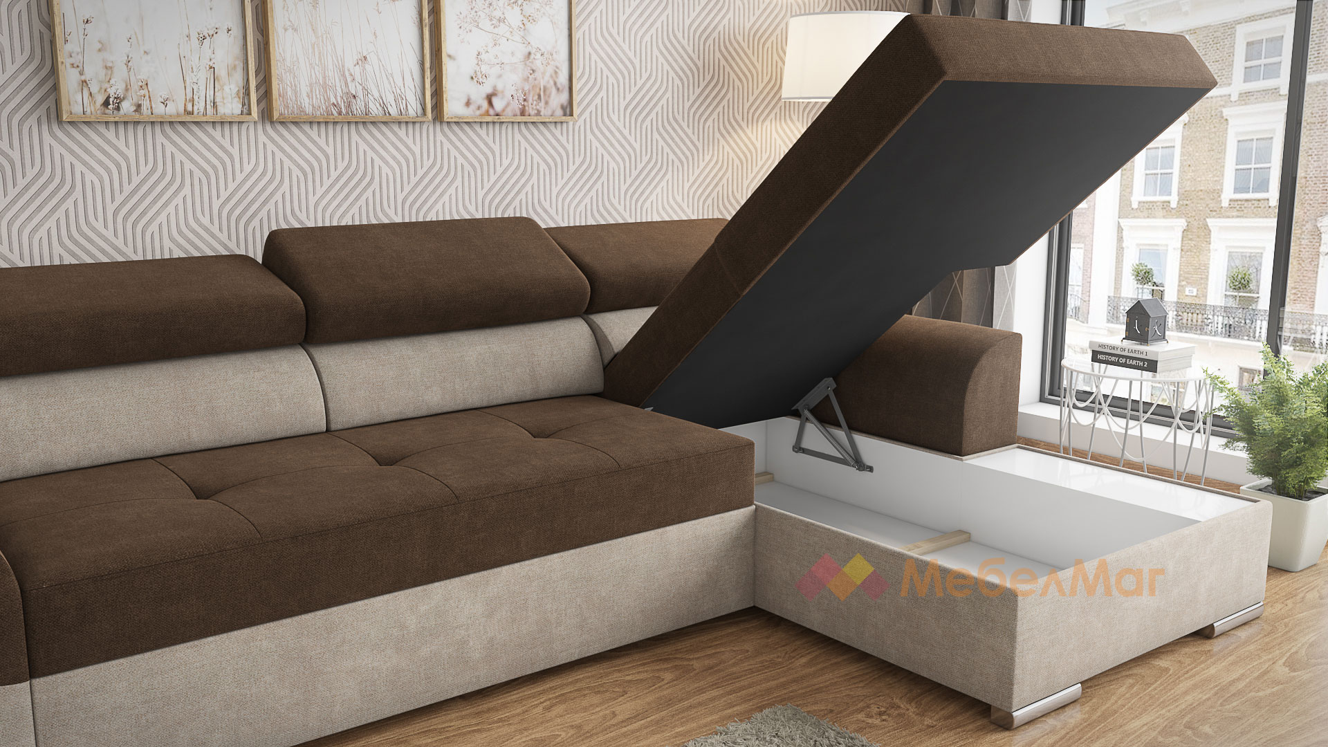 Функция сън ти предоставя място за отдих с размери 222/117 см, посредством изтеглящ се подматрак. Под лежанката е разположена голяма ракла за съхранение на багаж. Ъглов диван Болеро има също 3 движещи се подглавника – можеш да ги поставиш в три варианта, в зависимост от желанието и индивидуалния ти комфорт.