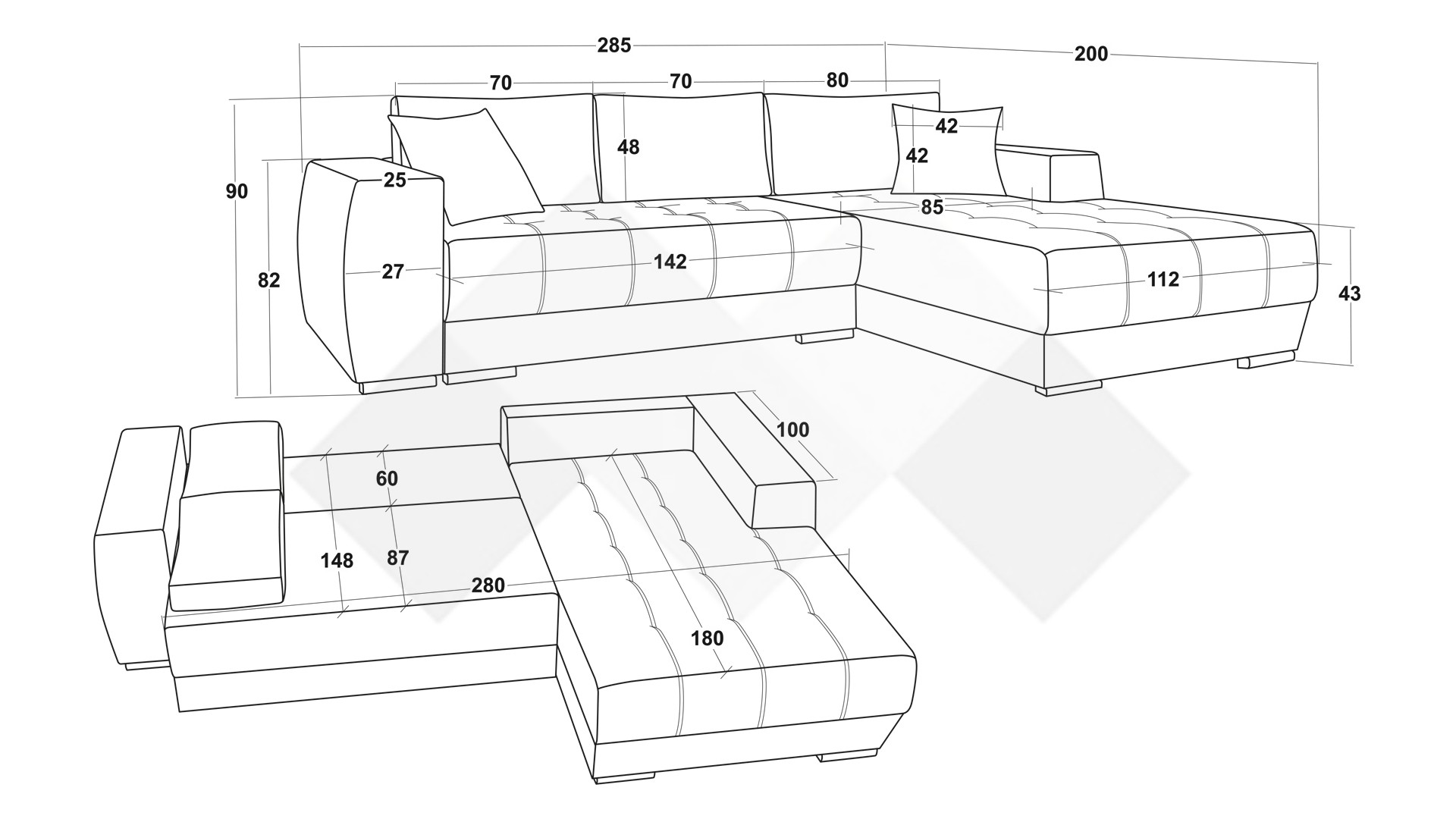 Диванът разполага с три броя големи и два броя по-малки декоративни възглавници, върху които да се отпуснеш след дълъг и уморителен ден. Освен това, има ракла, в която можеш да прибереш възглавници или завивки. Чрез функцията падащ гръб за секунди се превръща в удобно легло с площ за сън 148/280 см.