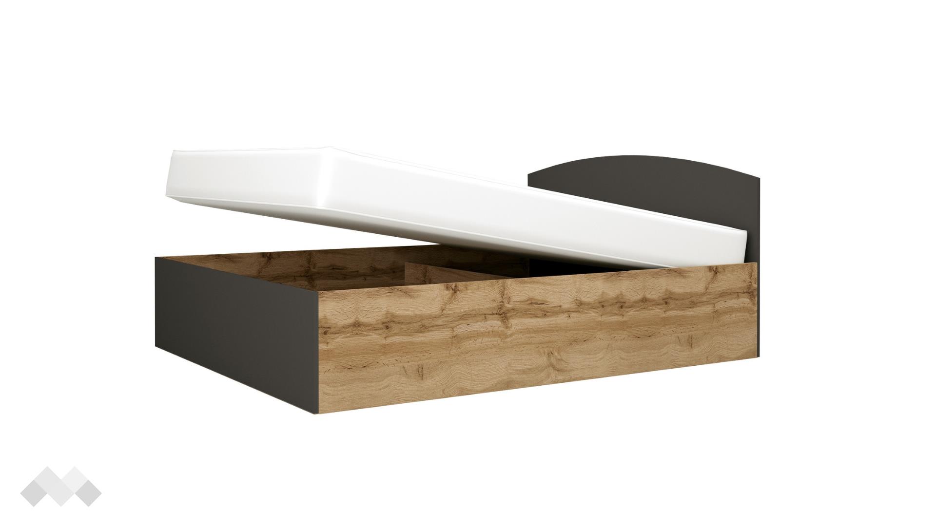 Спалнята е подходяща за матрак с размери 160/200 см, което я прави идеална за комфортен сън. Заоблената и по-ниска табла позволява да развихриш въображението си и да декорираш стената над нея за допълнителна индивидуалност. Включеният повдигащ механизъм осигурява лесен достъп до подматрачното пространство, което е идеално място за съхранение на спално бельо, одеяла, сезонни дрехи и други вещи.
