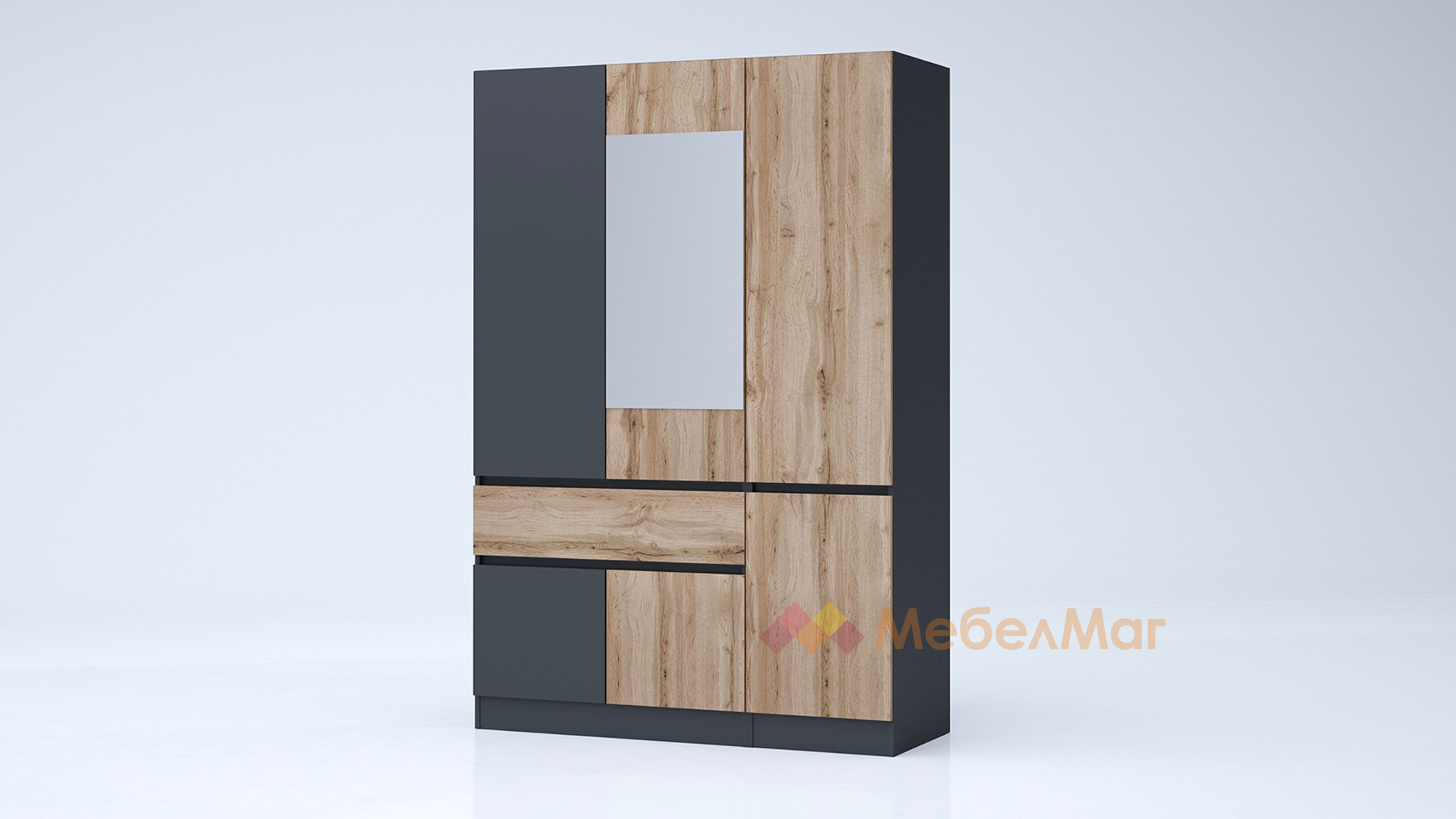 Гардеробът разполага с 2 лоста за закачалки, предоставящи достатъчно място за съхранение на ризи, сака, рокли и други дрехи, които трябва да бъдат окачени, запазвайки ги в перфектно състояние. Чекмеджето е идеално за съхранение на бельо, аксесоари или други лични вещи, осигурявайки лесен достъп и организираност. Под него се открива удобен шкаф с вратички, който предлага допълнително пространство за сгънати дрехи, кутии за обувки или други предмети, които искате да бъдат организирани и лесно достъпни. Огледалото е не само стилен акцент, но и практично допълнение, което ще ти помогне да се приготвиш за деня с лекота. Вратите на гардероба са оборудвани с механизъм за плавно затваряне, който осигурява тихо и нежно затваряне, предпазвайки мебелите и удължавайки техния живот.