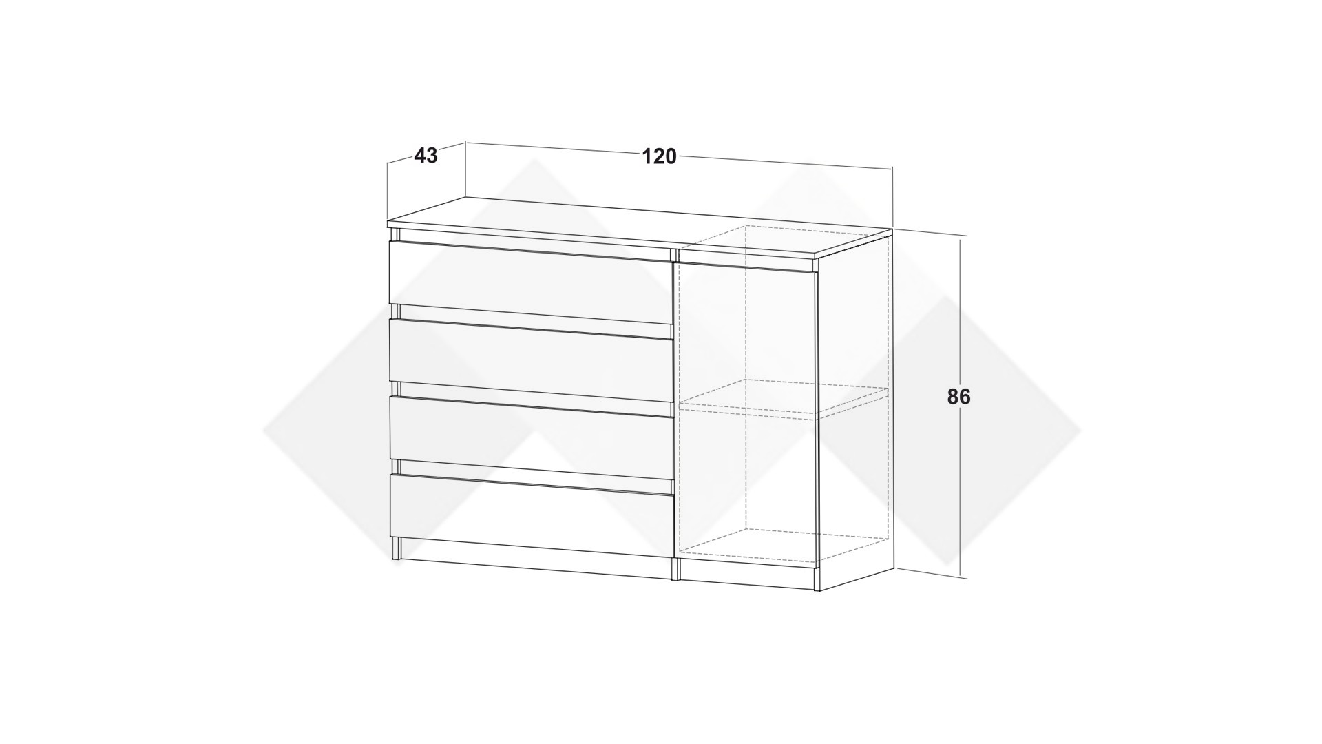 Скринът разполага с четири просторни чекмеджета, които предлагат обширно място за съхранение на бельо, аксесоари или други лични вещи. Чекмеджетата се движат плавно и безшумно, осигурявайки лесен достъп до съдържанието им. Шкафът с вратички ти предоставя перфектното място за съхранение на по-обемни вещи, кутии с аксесоари или всичко, което отдавна се чудиш къде да оставиш.