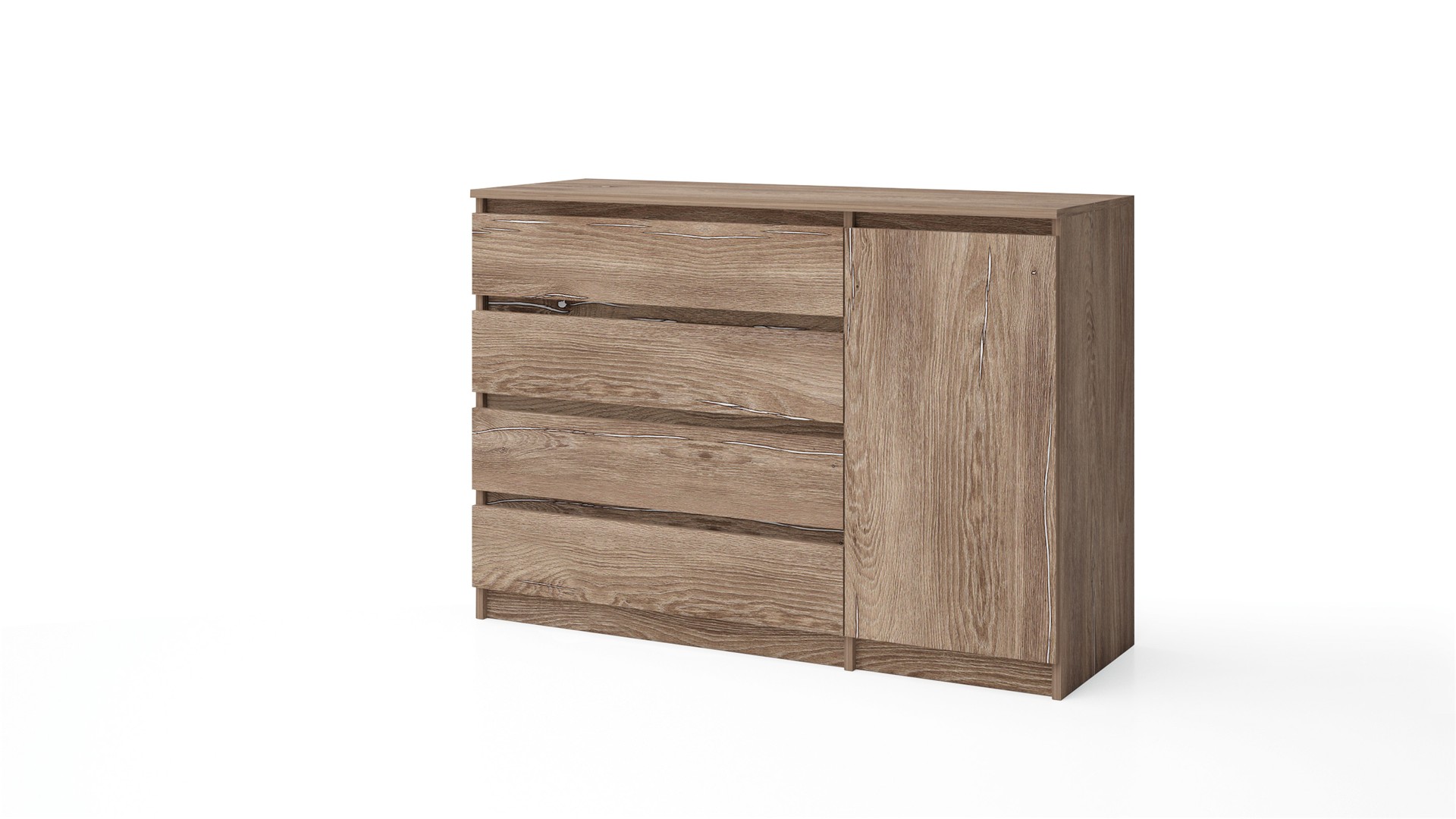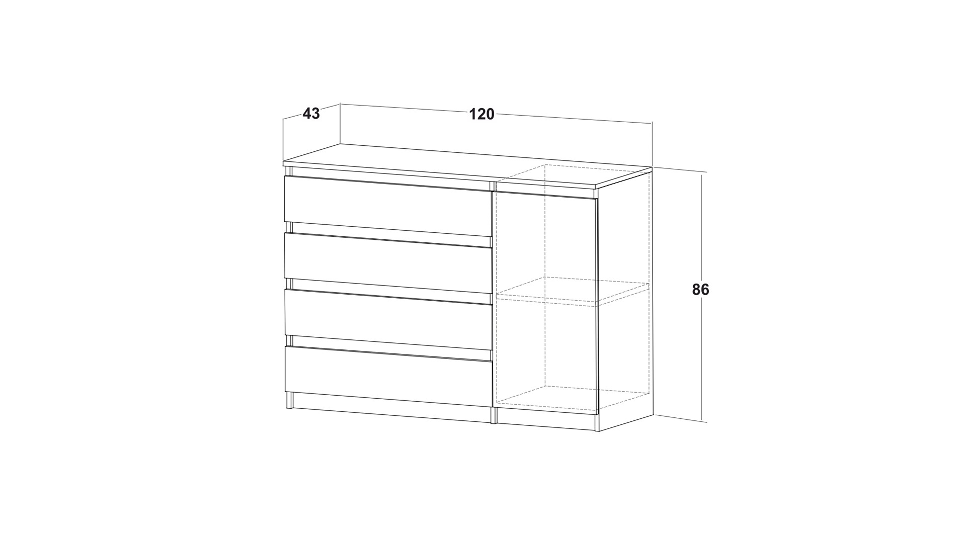 Скринът разполага с четири просторни чекмеджета, които предлагат обширно място за съхранение на бельо, аксесоари или други лични вещи. Чекмеджетата се движат плавно и безшумно, осигурявайки лесен достъп до съдържанието им. Шкафът с вратички ти предоставя перфектното място за съхранение на по-обемни вещи, кутии с аксесоари или всичко, което отдавна се чудиш къде да оставиш.