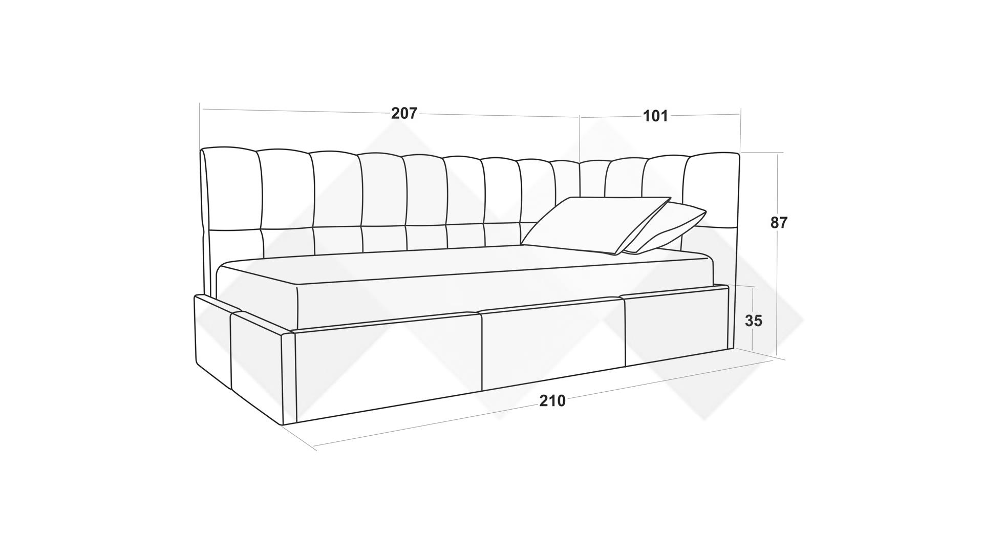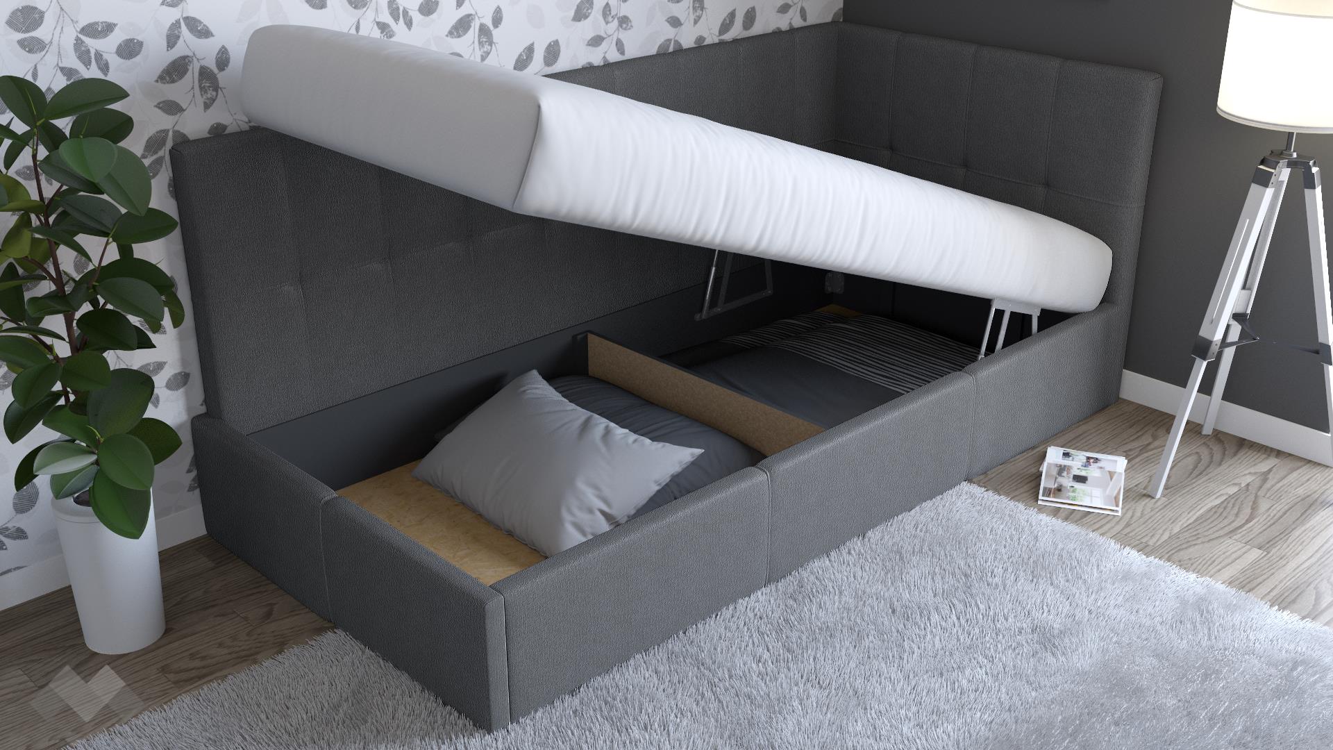Леглото е с меки форми и елегантен дизайн. Подходящо е за матрак 90/200 см. Под матрака се открива широко пространство, готово да побере всички възглавници и завивки, на които все не намираш място. Така не се налага да закупуваш допълнителни шкафове у дома и пестиш пространство и пари.