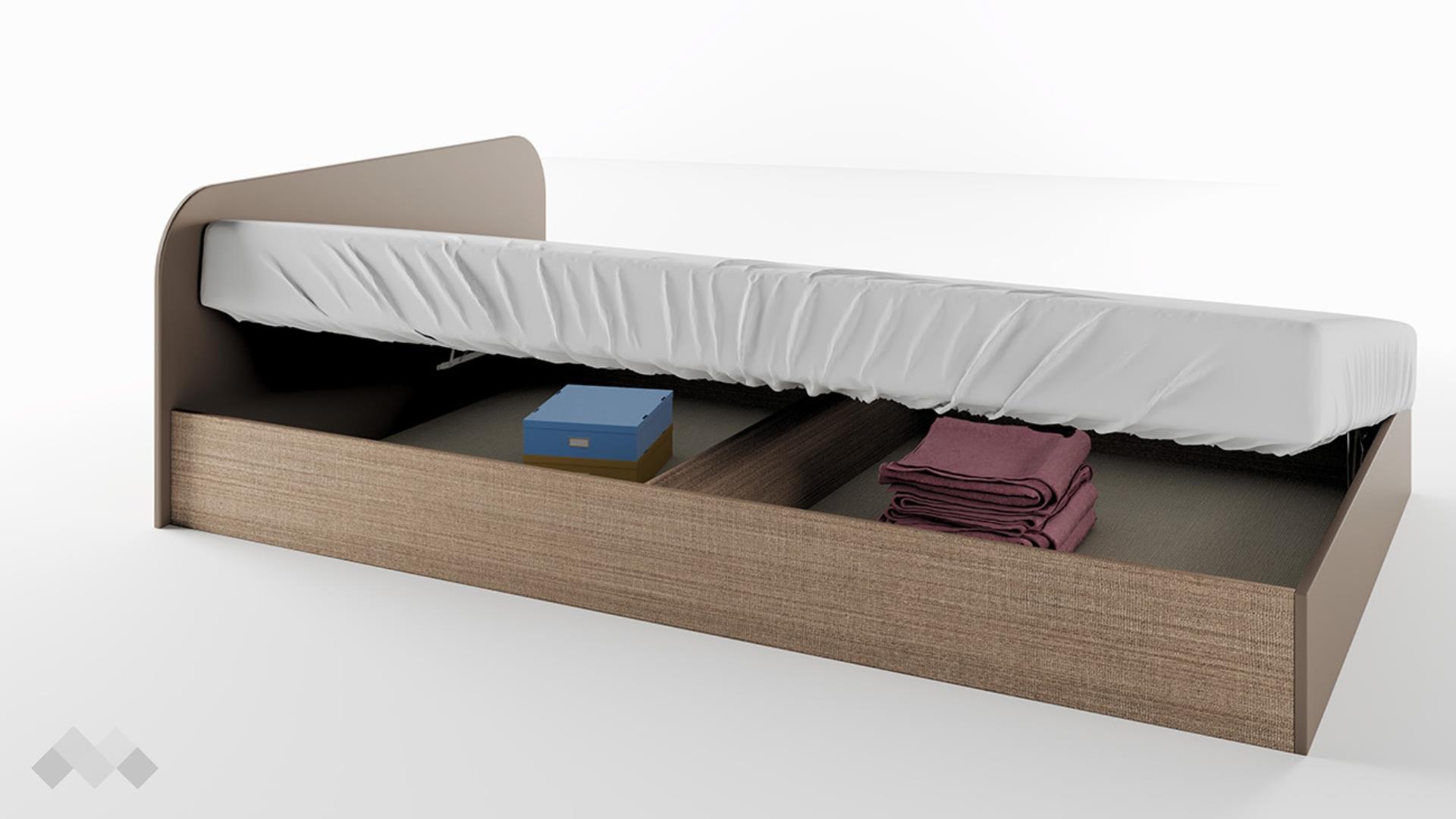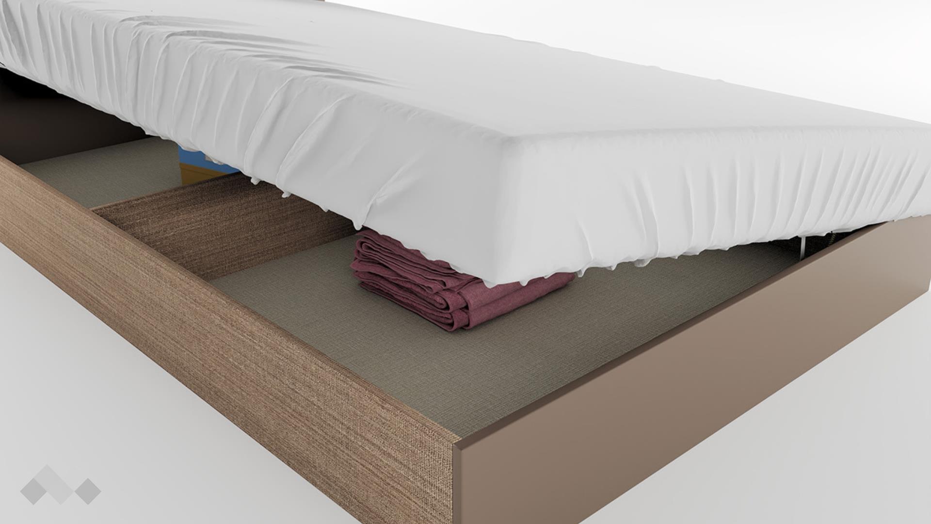 Леглото има още една полезна функция – включеният в комплекта повдигащ пружинен механизъм повдига матрака и открива широко пространство, готово да побере всички възглавници и завивки, на които все не се намира място.