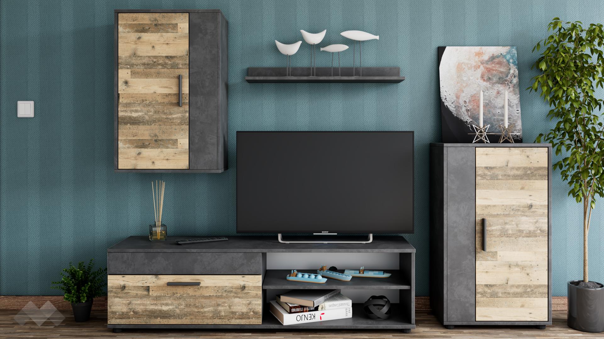 ⭐ Предимства: ✓ 2 отворени рафта ✓ ТВ шкаф ✓ висок шкаф ✓ окачен шкаф ✓ етажерка ✓ модерен дизайн ✓ функционална и практична ✓ качествена изработка ✓ 16 мм ПДЧ