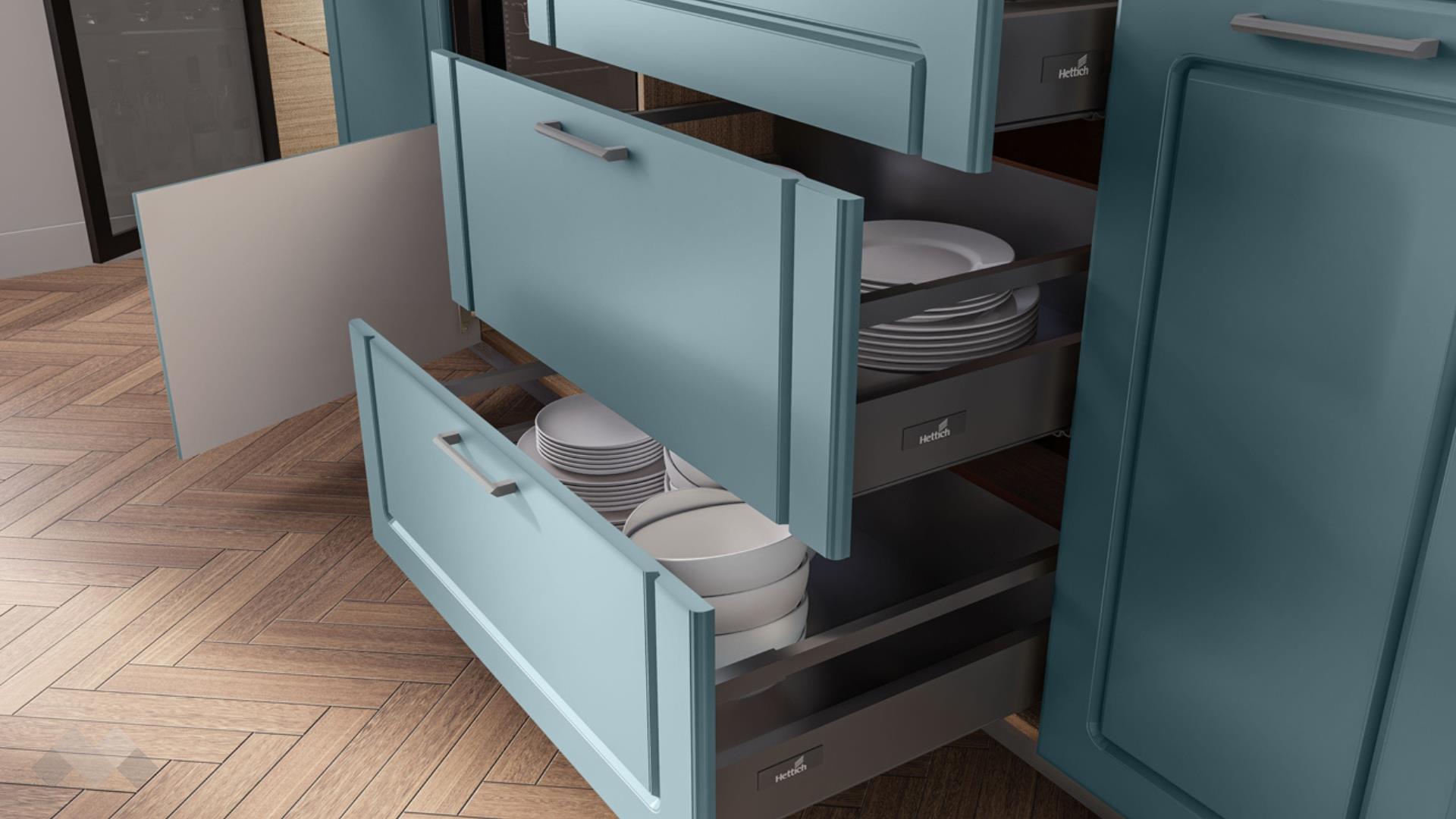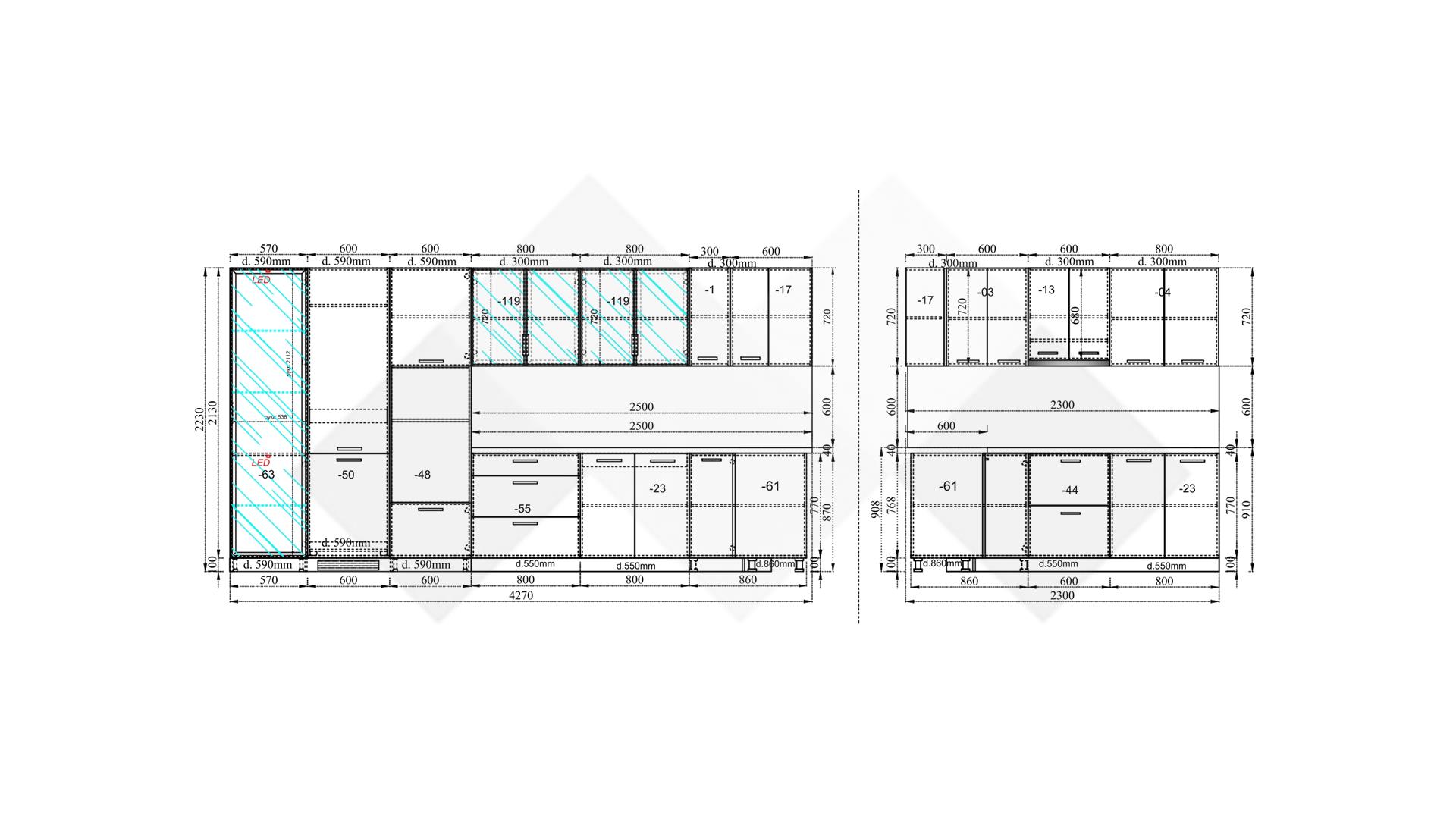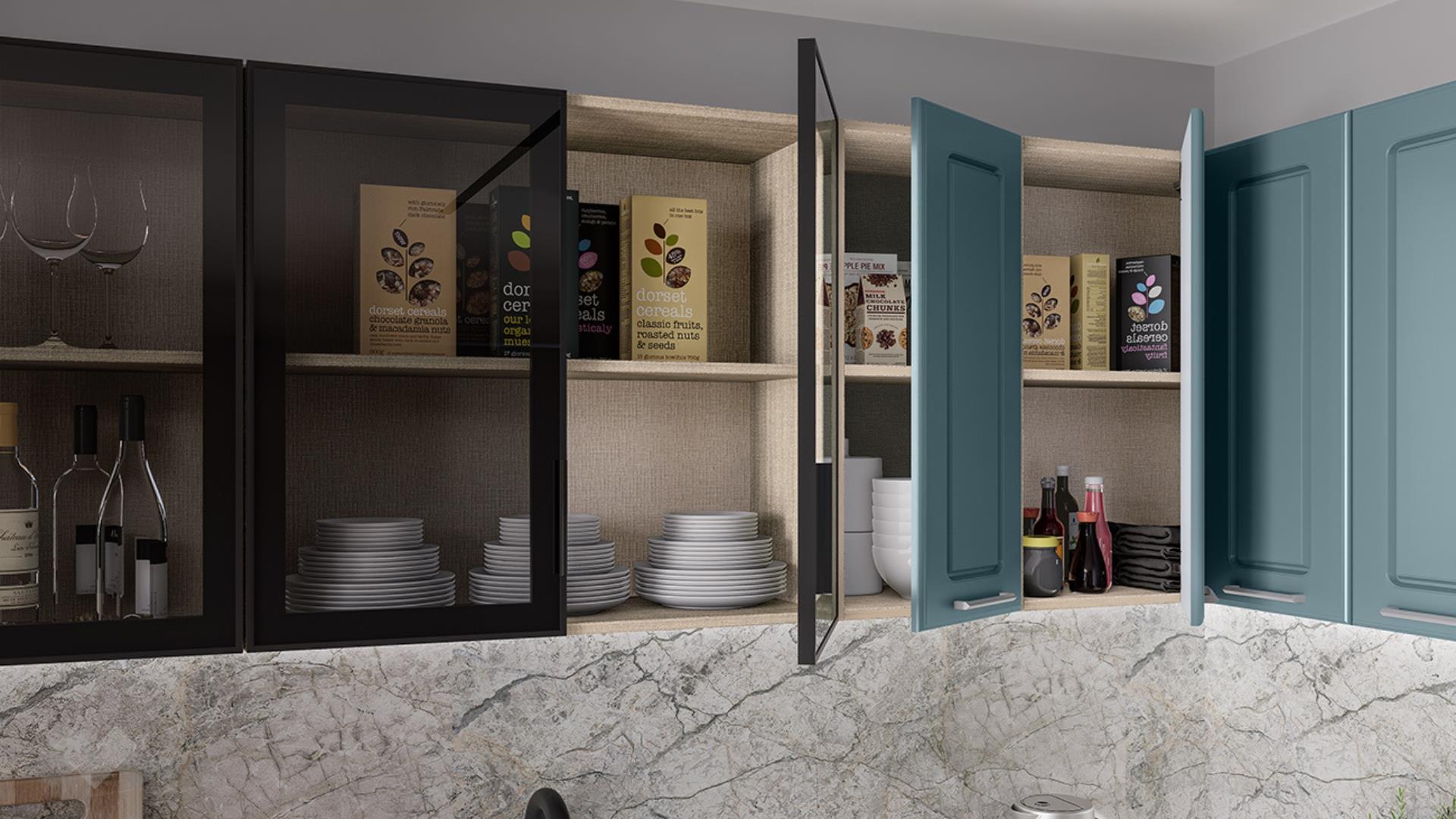 Горния ред шкафове са достатъчно на брой и големина, че да поберат както малко използваните уреди, така и тези, които използваш всчки ден. Шкаф стандартен размер за вграждане на хладилник - за да бъде всичко в синхрон. Шкаф за вграждане на фурна и микровълнова. Долния ред шкафове е функционално подбран - перфектната комбинация на рафтове и чекмеджета, за да поберат често използваните уреди, подправки и посуда. Витринния шкаф е с опушени матови стъкла 4 мм., 4 рафта и LED осветление, за да изглежда още по-елегантно.