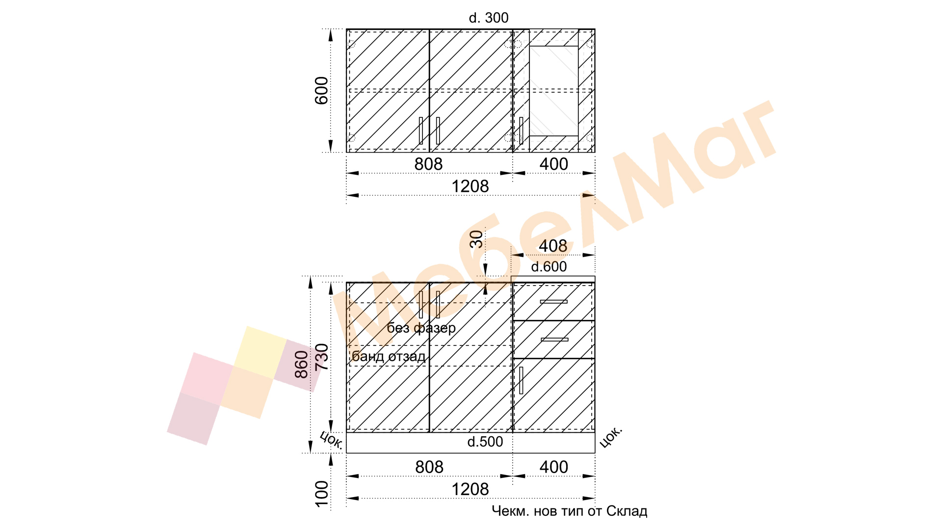Долен ред: Д: 120.8 см Ш: 60 см В: 86 см